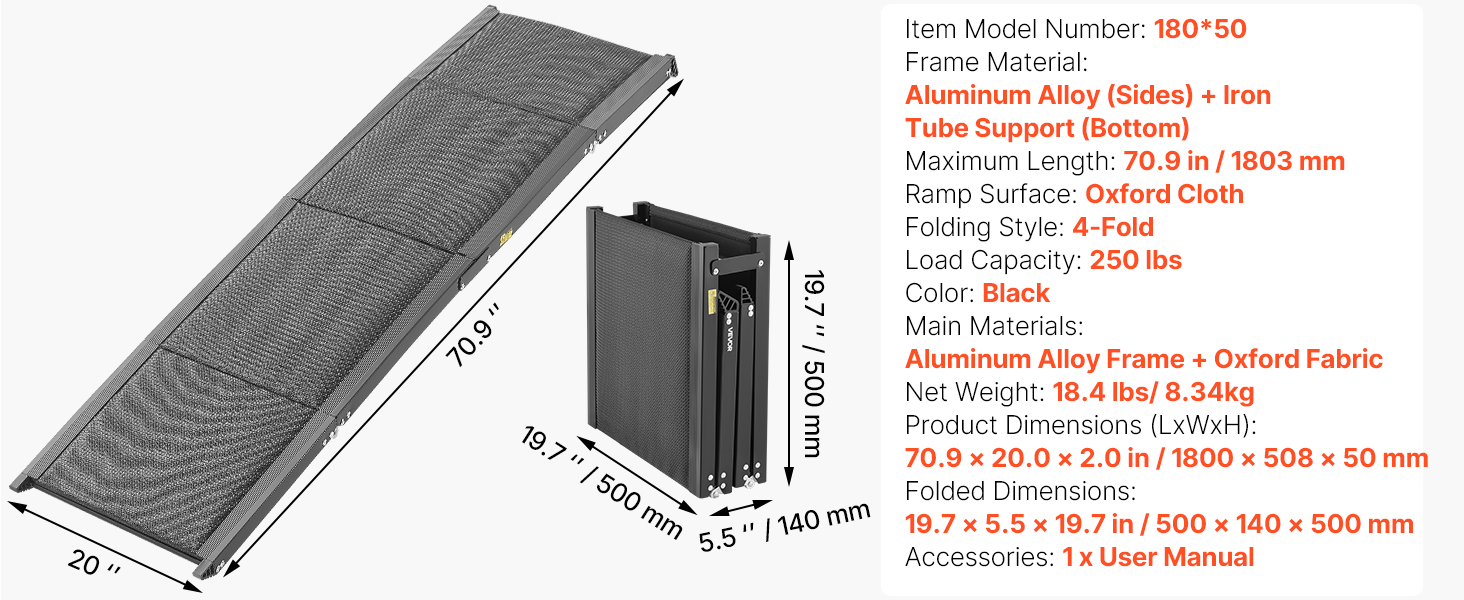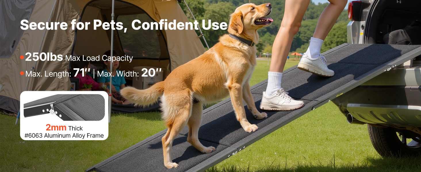 Táto 80 in predĺžená rampa pre domáce zvieratá s vysokopevnostným hliníkom 6063 a 2 mm zosilneným rámom unesie až 250 libier. Robustná konštrukcia zabraňuje kývaniu a protišmykový povrch udržiava stabilitu domácich zvierat pri pohybe nahor alebo nadol.