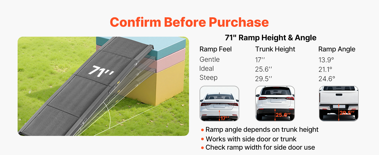 Pred kúpou skontrolujte výšku kufra vášho vozidla a šírku rampy, aby ste sa uistili, že rampa bezpečne zapadne do kufra alebo bočných dverí.