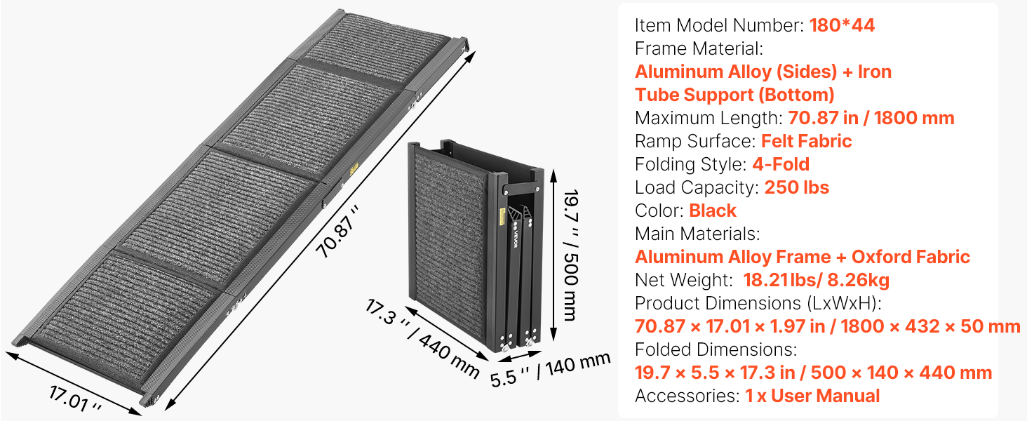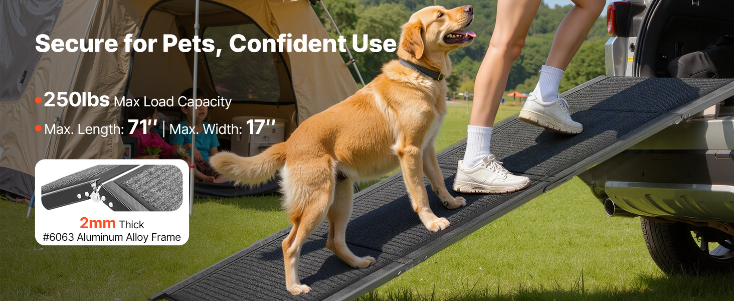 Táto 71 v predĺžená rampa pre domáce zvieratá s vysokopevnostným hliníkom 6063 a 2 mm zosilneným rámom unesie až 250 libier. Robustná konštrukcia zabraňuje kývaniu a protišmykový povrch udržiava stabilitu domácich zvierat pri pohybe nahor alebo nadol.