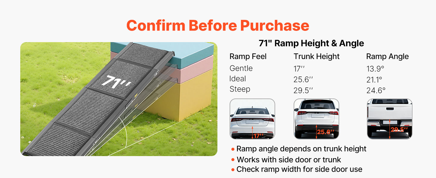 Pred kúpou skontrolujte výšku kufra vášho vozidla a šírku rampy, aby ste sa uistili, že rampa bezpečne zapadne do kufra alebo bočných dverí.