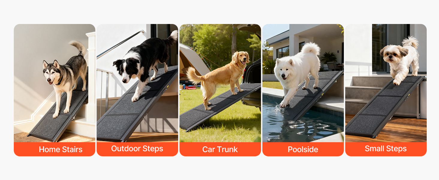 Rampa pre veľkého psa je ideálna pre autá, vnútorné schody, vonkajšie schody, karavany alebo bazény. Znižuje namáhanie kĺbov, čím zabezpečuje bezpečný a pohodlný pohyb domácich miláčikov v každom scenári a poskytuje vám pokoj počas výletov.