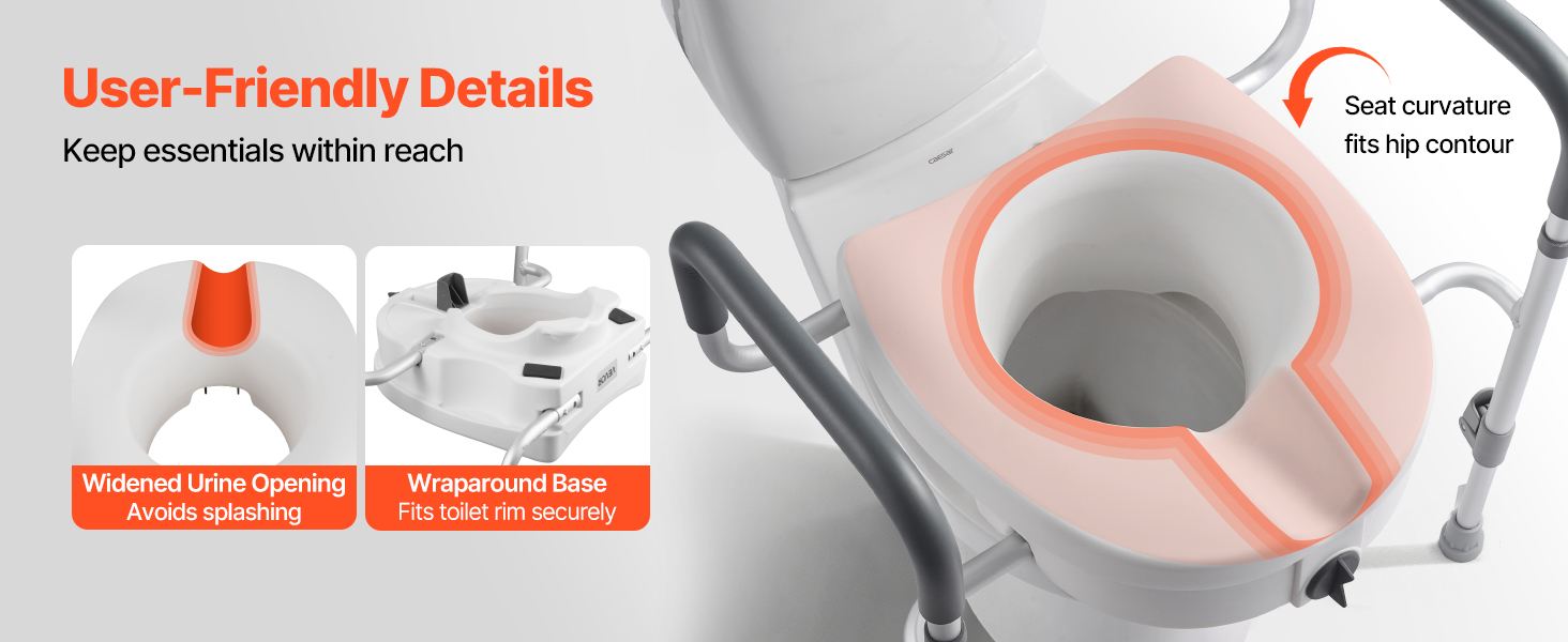 Zvýšené záchodové sedadlo využíva hladký, zakrivený dizajn na pohodlné sedenie, zatiaľ čo rozšírený otvor na moč pomáha predchádzať postriekaniu. Ovinutá základňa dodáva dodatočnú stabilitu a zaisťuje bezpečné a isté používanie.
