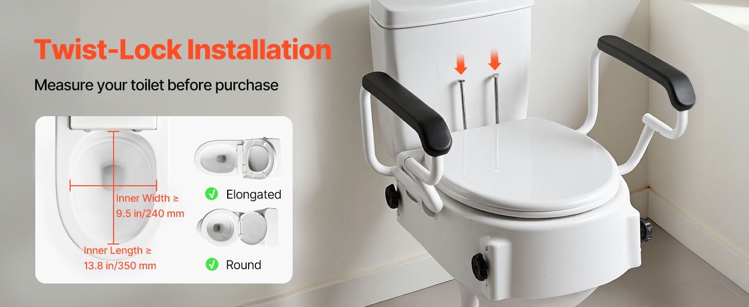 Zvýšené záchodové sedadlo sa vyznačuje jednoduchým a rýchlym nastavením, ktoré zvládne jedna osoba. Pred kúpou skontrolujte tvar a veľkosť vašej toalety, aby ste sa uistili o správnom prispôsobení - kompatibilné typy nájdete na obrázkoch.