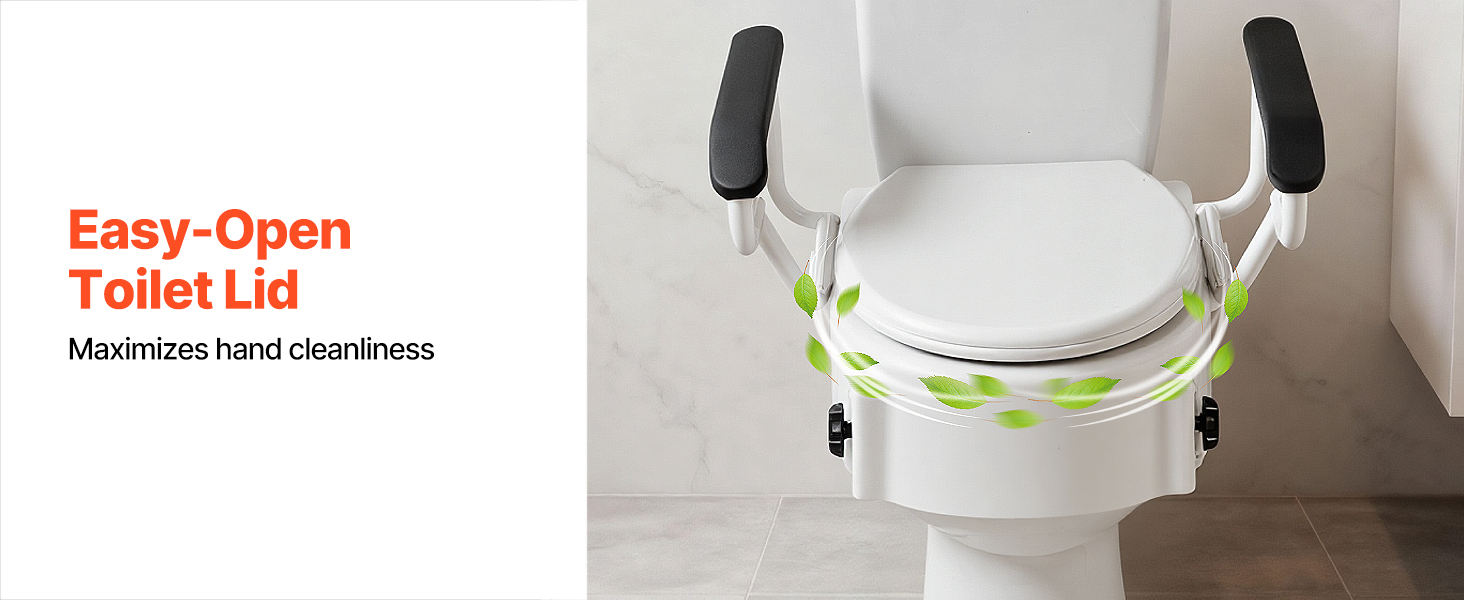 Toto vyvýšené záchodové sedadlo sa dodáva so zabudovaným vekom. Malý otvor s drážkou v prednej časti umožňuje ľahké zdvihnutie veka bez toho, aby ste sa ho dotkli, čím si udržíte čisté ruky.