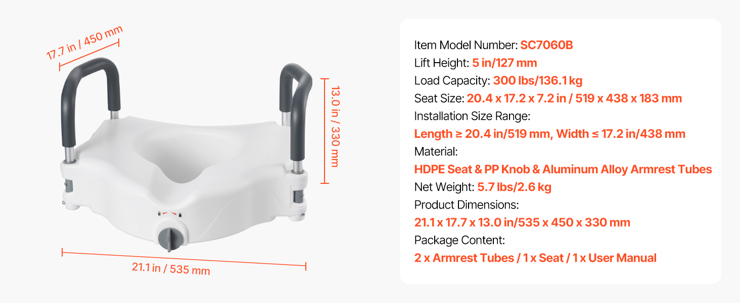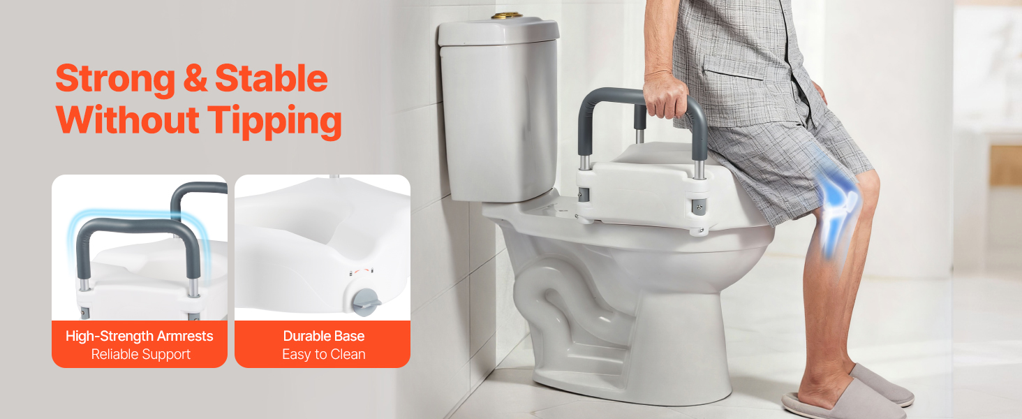 Toto záchodové sedadlo pre telesne postihnutých je vyrobené z odolných a kvalitných materiálov a je odolné voči opotrebovaniu a praskaniu. Jeho pevná konštrukcia poskytuje spoľahlivú oporu a bez obáv sa prispôsobí používateľom s rôznymi typmi postavy a hmotnosťou.