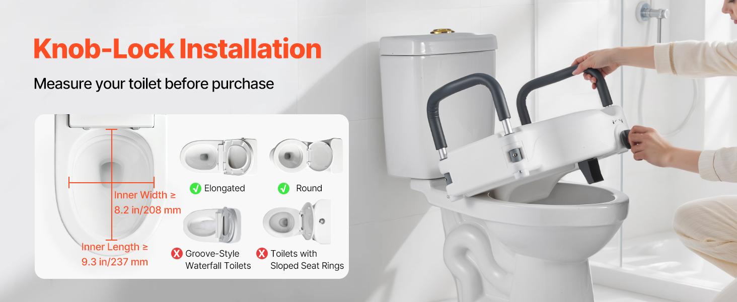 Zvýšené záchodové sedadlo sa vyznačuje jednoduchým a rýchlym nastavením, ktoré zvládne jedna osoba. Pred kúpou skontrolujte tvar a veľkosť vašej toalety, aby ste sa uistili o správnom prispôsobení - kompatibilné typy nájdete na obrázkoch.
