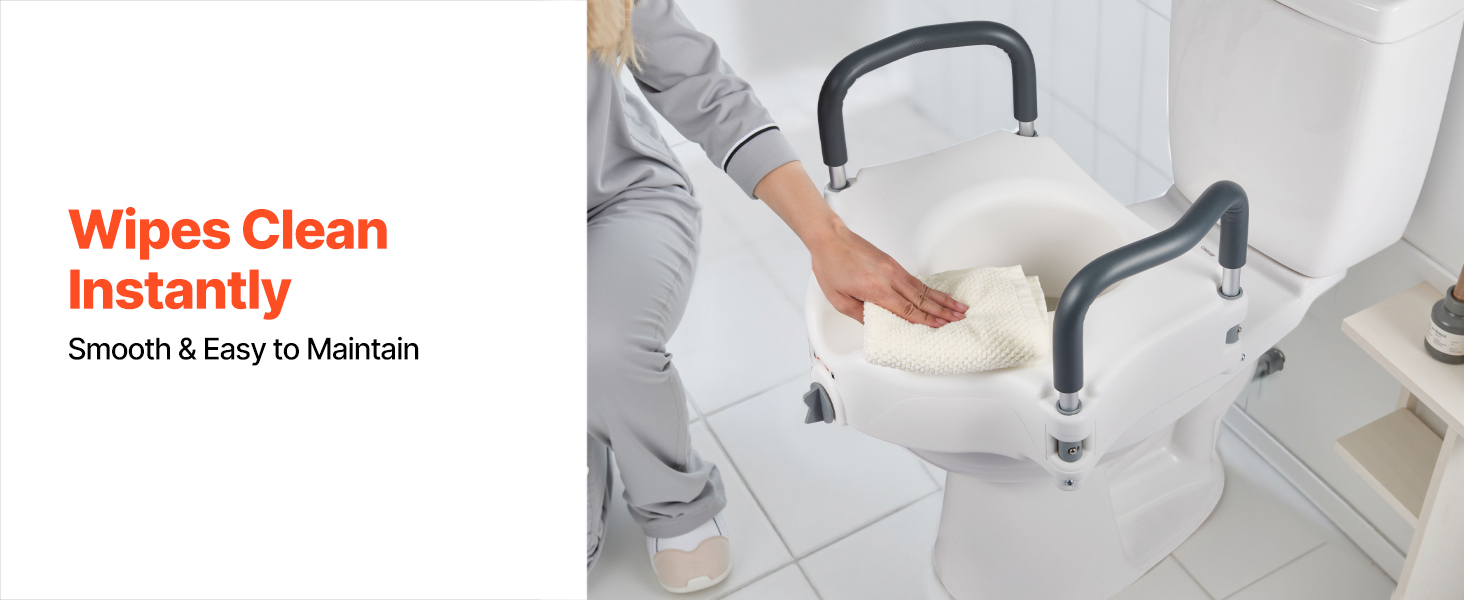 Toto vyvýšené WC sedadlo sa dodáva s vynikajúcou odolnosťou proti vlhkosti a korózii. Jeho hladký, neporézny povrch blokuje usadzovanie nečistôt, takže sa rýchlo a jednoducho utiera.