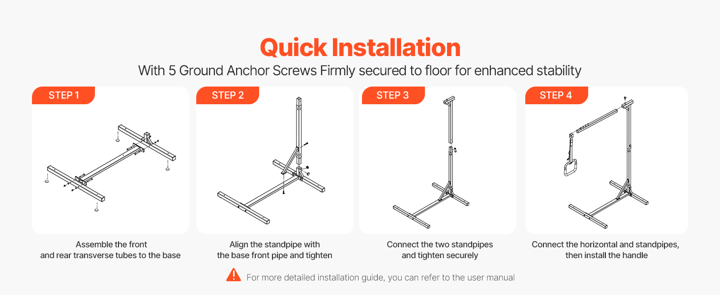 Naša voľne stojaca hrazda sa dodáva so súpravou montážneho príslušenstva a jej inštalácia je jednoduchá a nevyžaduje žiadne zložité nástroje. Možno ju bez námahy nastaviť tak, aby poskytovala pevnú a spoľahlivú oporu, pomáhala pri každodennej mobilite a zvyšovala kvalitu života.