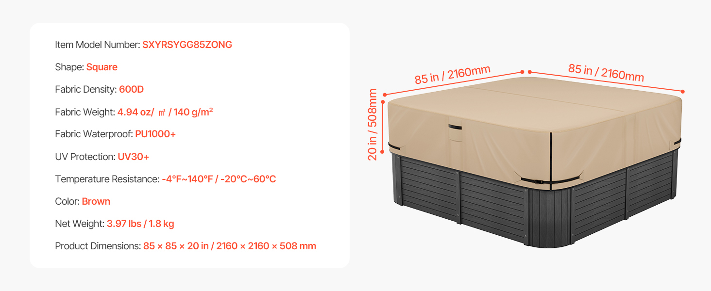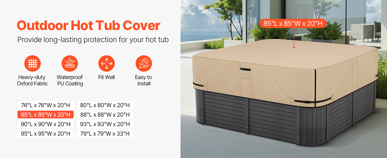 Náš kryt na vírivku je určený na vonkajšie použitie a má rozmery 85 "D x 85 "Š x 20 "V (2160 x 2160 x 508 mm). Upozornenie: Pred objednaním si nezabudnite zmerať dĺžku a šírku vašej vírivky, aby ste sa uistili, že vám správne padne.