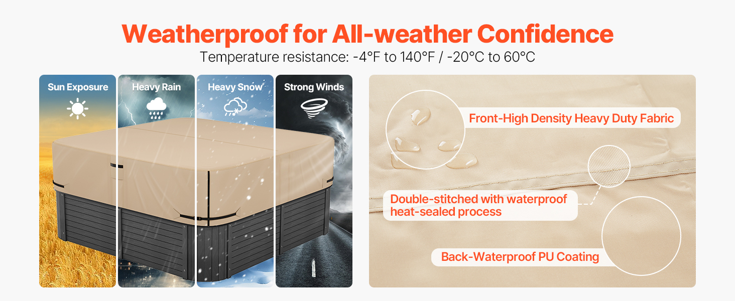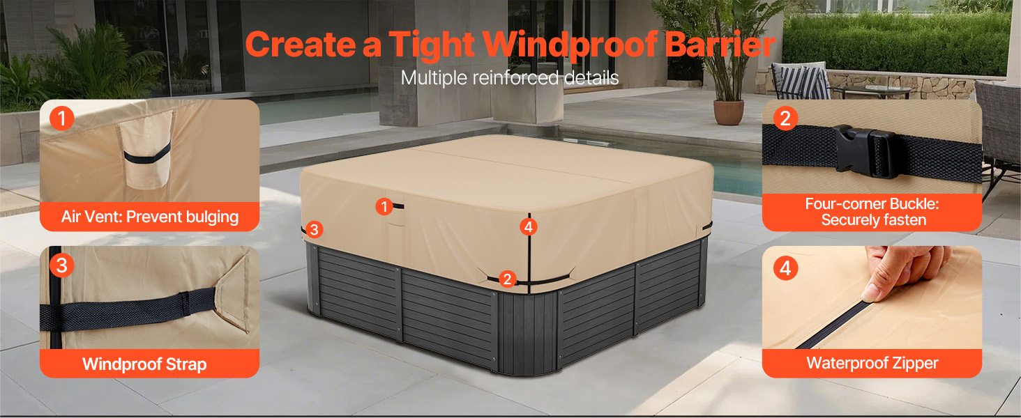 Vďaka viacerým výstužným detailom chránič krytu vírivky dokonale sedí na vírivke. Vetrací otvor pomáha predchádzať vydutiu a každý roh je vybavený nastaviteľnou prackou, vodotesným zipsom a pevným popruhom, čo zaručuje, že zostane pevne na mieste aj pri silnom vetre.