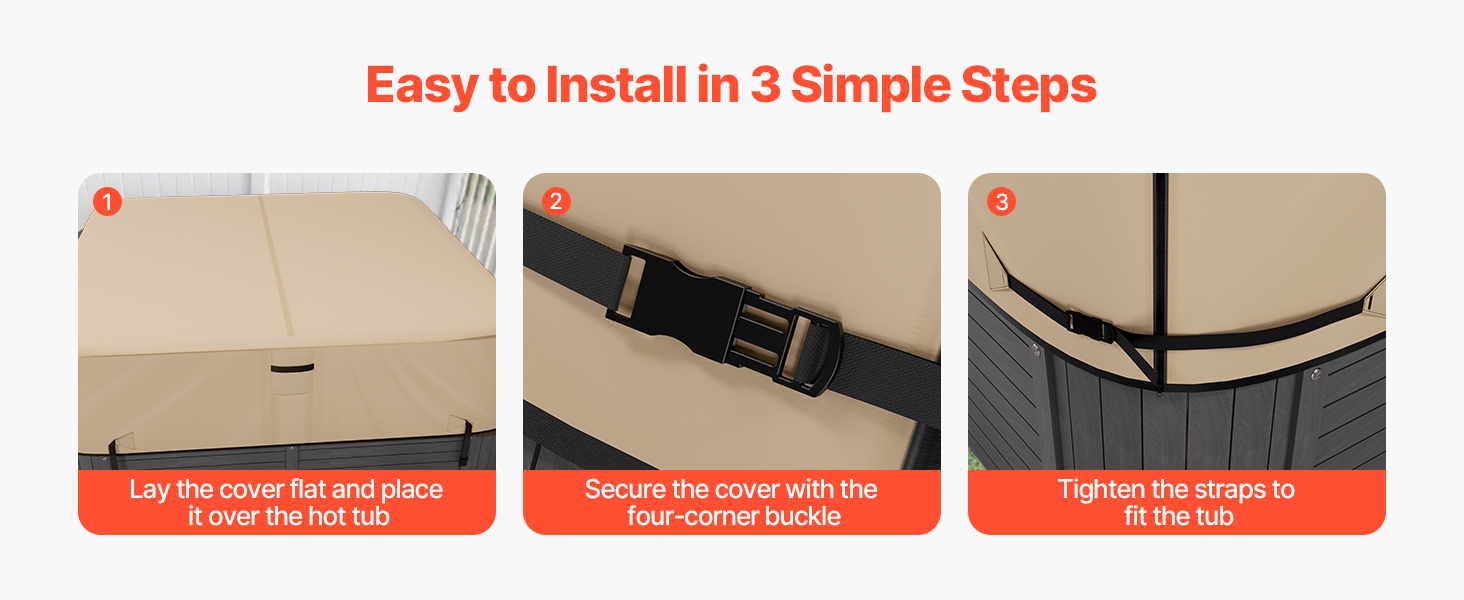 Náš kúpeľový kryt na vírivku sa ľahko inštaluje pomocou jednoduchých krokov, ktoré umožňujú jednej osobe rýchlo a jednoducho nainštalovať alebo odstrániť kryt.