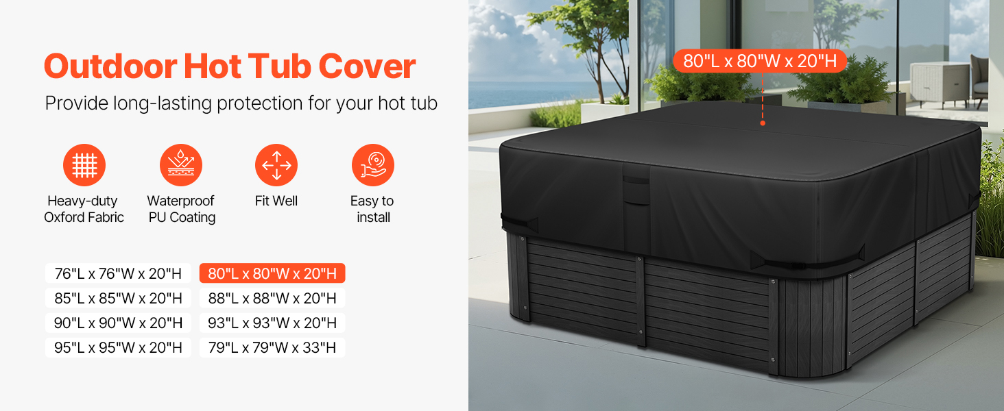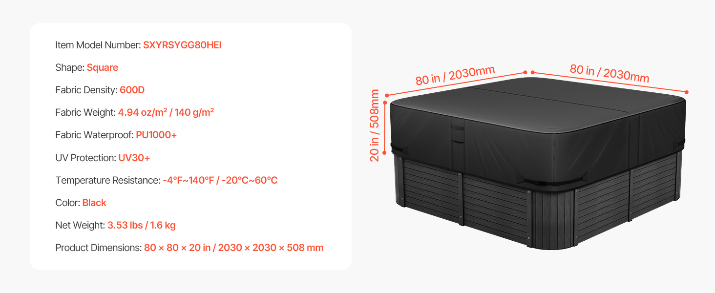 Náš kryt na vírivku je určený na vonkajšie použitie a má rozmery 80 "D x 80 "Š x 20 "V (2030 x 2030 x 508 mm). Upozornenie: Pred objednaním si nezabudnite zmerať dĺžku a šírku vašej vírivky, aby ste sa uistili, že vám správne padne.