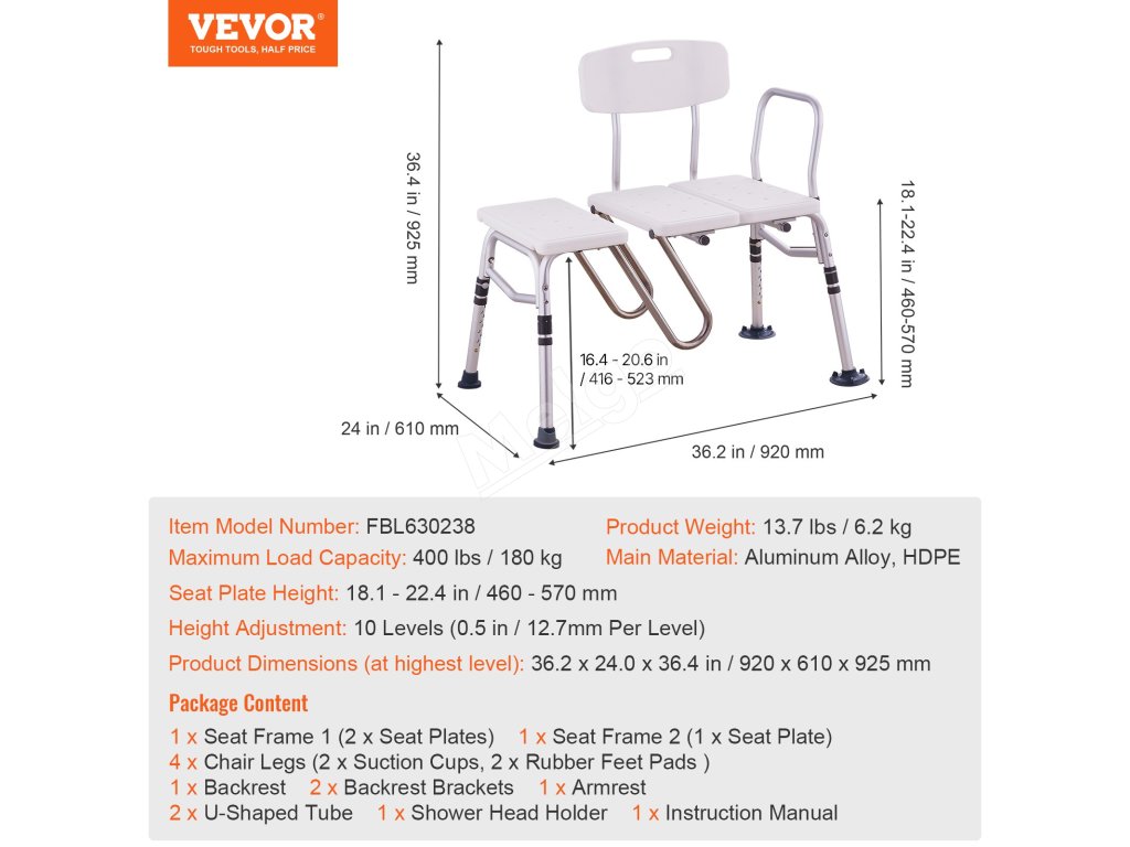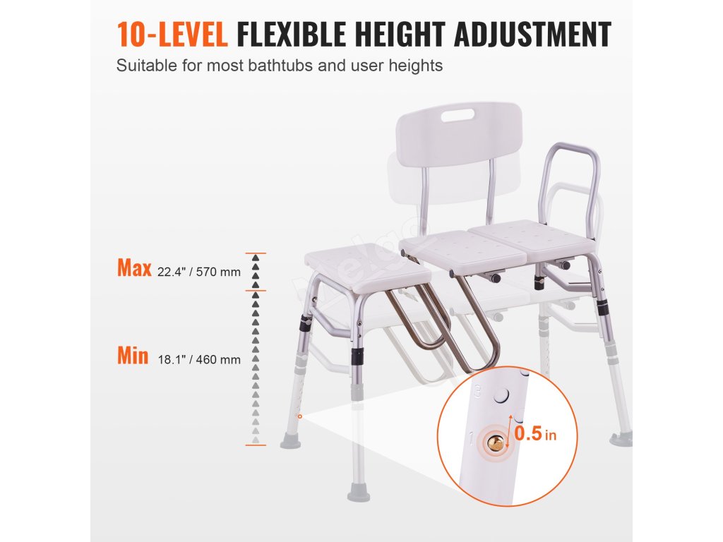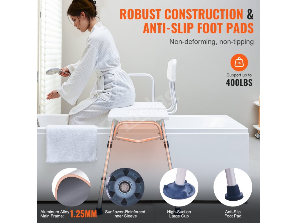 S lavičkou VEVOR na prenášanie do vane sa stanete v kúpeľni bezpečnejšími. Táto lavička na prenášanie do vane, ktorá je ideálna pre seniorov, zdravotne postihnutých a tehotné ženy, má 10 nastaviteľných výšok, podporu 400 libier, ochranný dizajn v tvare písmena "u" a obojstranné operadlo pre maximálne pohodlie.