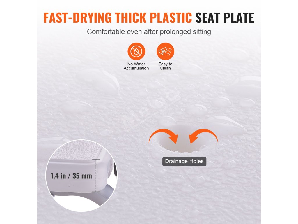 Posaďte sa a relaxujte na predĺženom, mäkkom, 1,4-palcovom sedadle z HDPE plastu, ktoré je navrhnuté pre dlhotrvajúce pohodlie. Vďaka viacerým odtokovým otvorom rýchlo schne a zostáva hygienické. Čistenie je bezproblémové - stačí ho po každom použití utrieť, aby ste ho mohli bezproblémovo udržiavať.