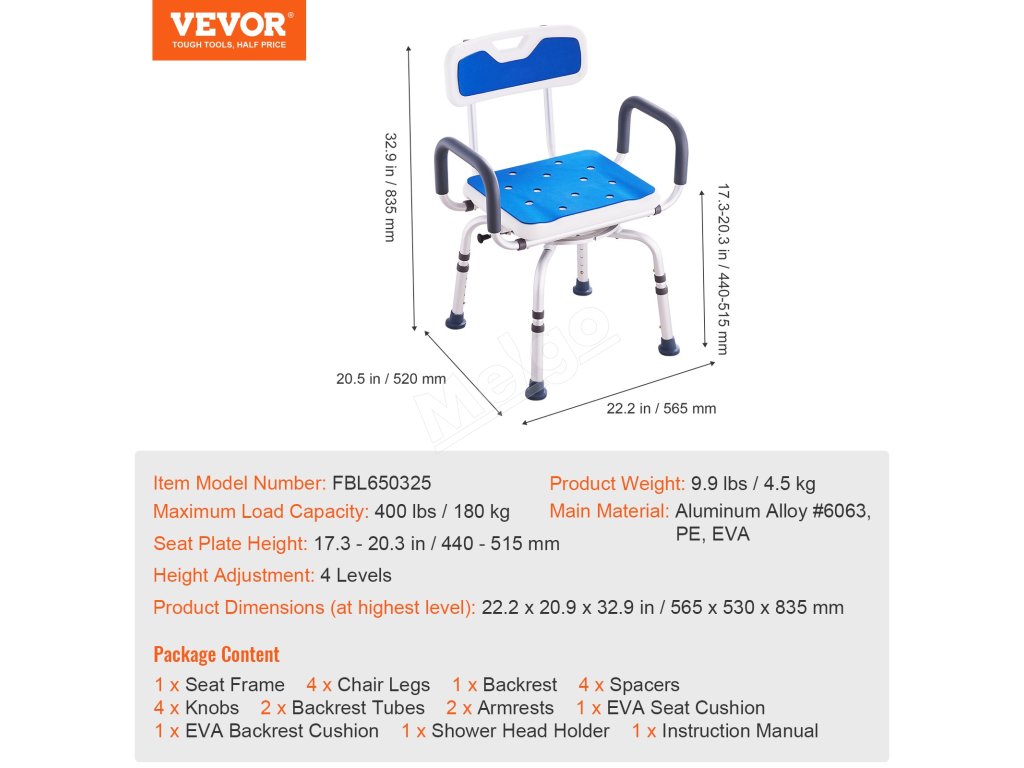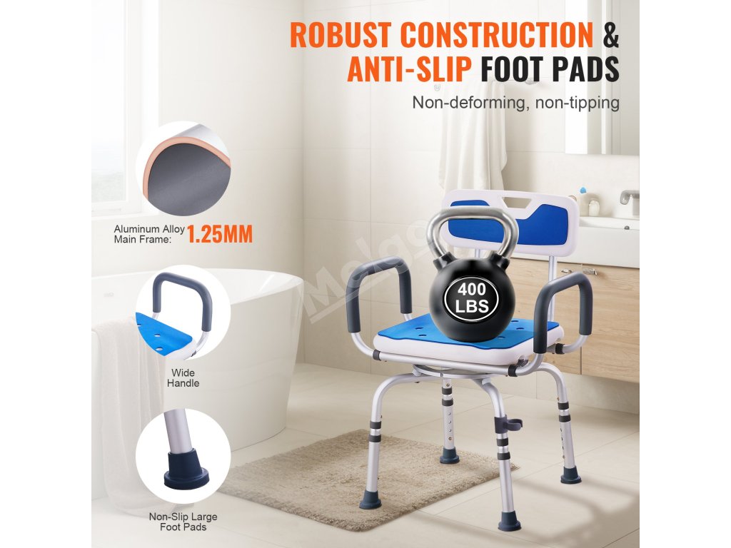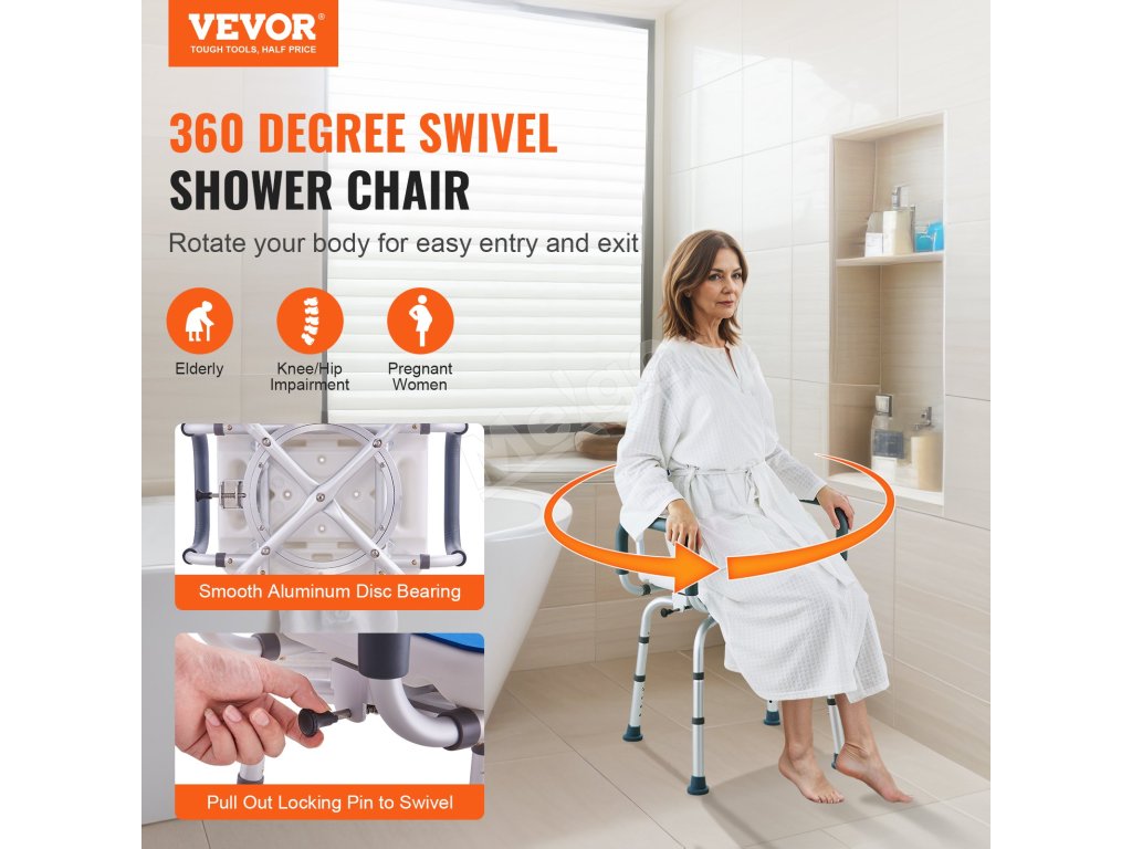 Sprchujte sa bezpečnejšie a pohodlnejšie s 360° otočnou stoličkou VEVOR. Toto sprchovacie sedadlo, ktoré je ideálne pre seniorov, zdravotne postihnutých a tehotné ženy, má 360° otočné sedadlo, 4 nastaviteľné výškové stupne, nosnosť 400 libier a široké opierky na ruky pre maximálne pohodlie.