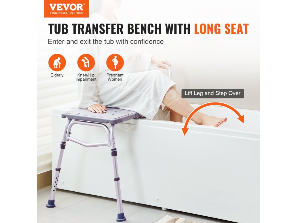 Zabezpečte si bezpečnejší a pohodlnejší pobyt v kúpeľni s lavičkou na prenášanie do vane VEVOR. Táto lavička na prenášanie do vane, ktorá je ideálna pre seniorov, zdravotne postihnutých a tehotné ženy, má 10 úrovní nastaviteľnej výšky, nosnosť 400 libier a obojstranné operadlo pre maximálne pohodlie.