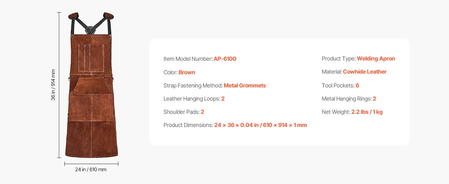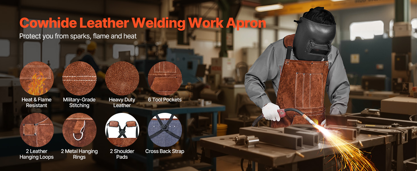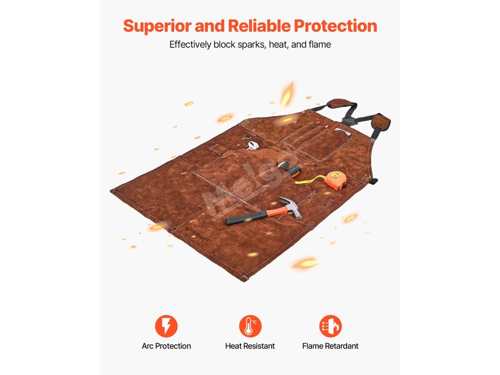Zvárajte bezpečnejšie s našou zváračskou zásterou z vysokopevnostnej hovädzej kože. Je odolná voči plameňom a trvácna, poskytuje spoľahlivú ochranu pred iskrami a plameňmi. Vďaka 6 vreckám na náradie, 2 koženým pútkam na zavesenie a 2 kovovým závesným krúžkom, nastaviteľným krížovým popruhom na chrbte je ideálnym spoločníkom pri zváraní.