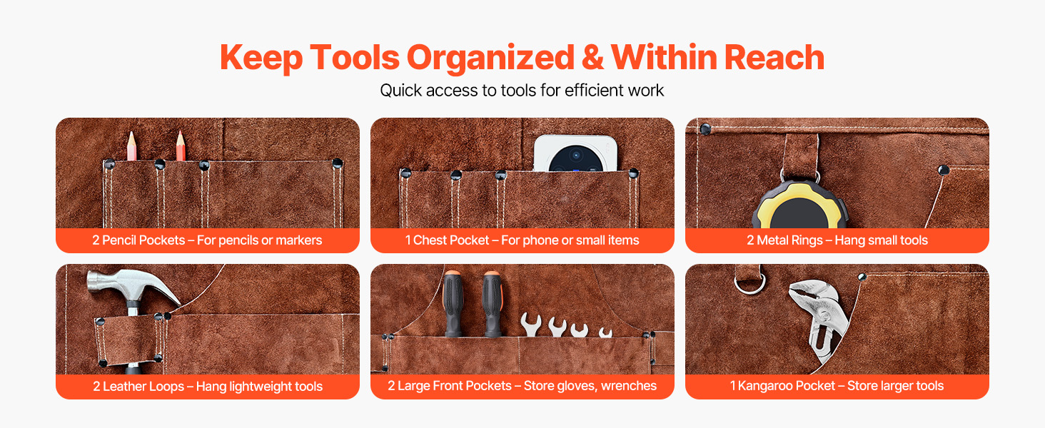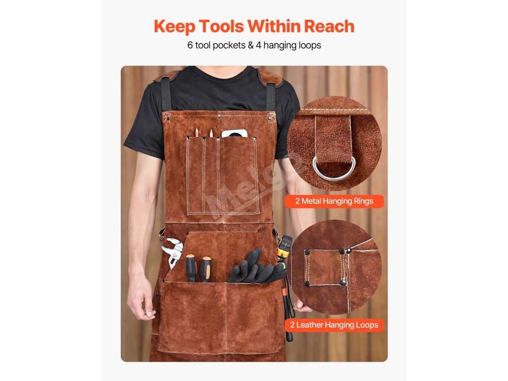 Vybavená 6 vreckami na náradie, 2 koženými pútkami na zavesenie a 2 kovovými krúžkami na zavesenie, naša odolná fr zváračská zástera poskytuje dostatok úložného priestoru pre vaše základné náradie, čím zabezpečuje ich ľahký prístup na zvýšenie pohodlia a efektivity práce.