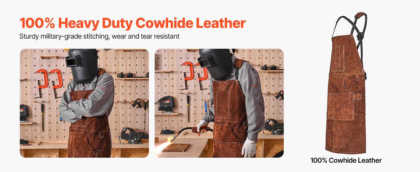 Táto zváračská pracovná zástera je vyrobená z odolnej hovädzej kože s vojenským prešívaním, je odolná proti opotrebovaniu, roztrhnutiu a je stvorená na náročné práce, ako je zváranie, kováčstvo a práca s drevom.