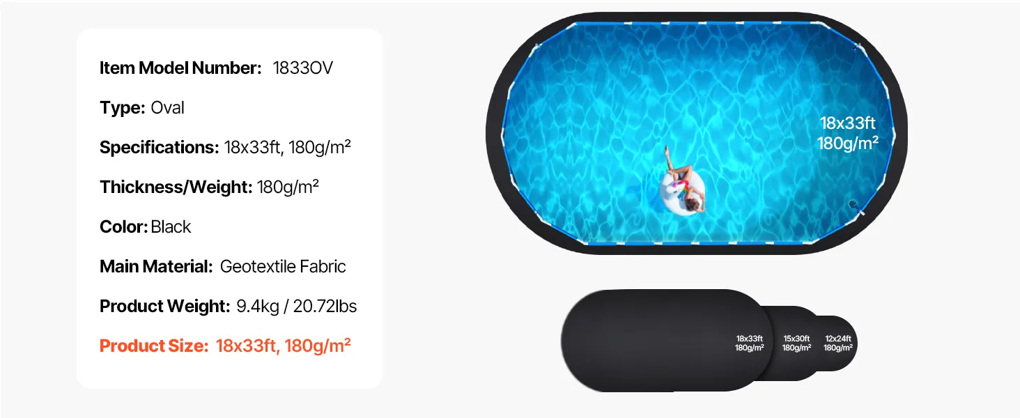 | Veľkosť výrobku | Ovál, 18x33 stôp, 180g/m2 |