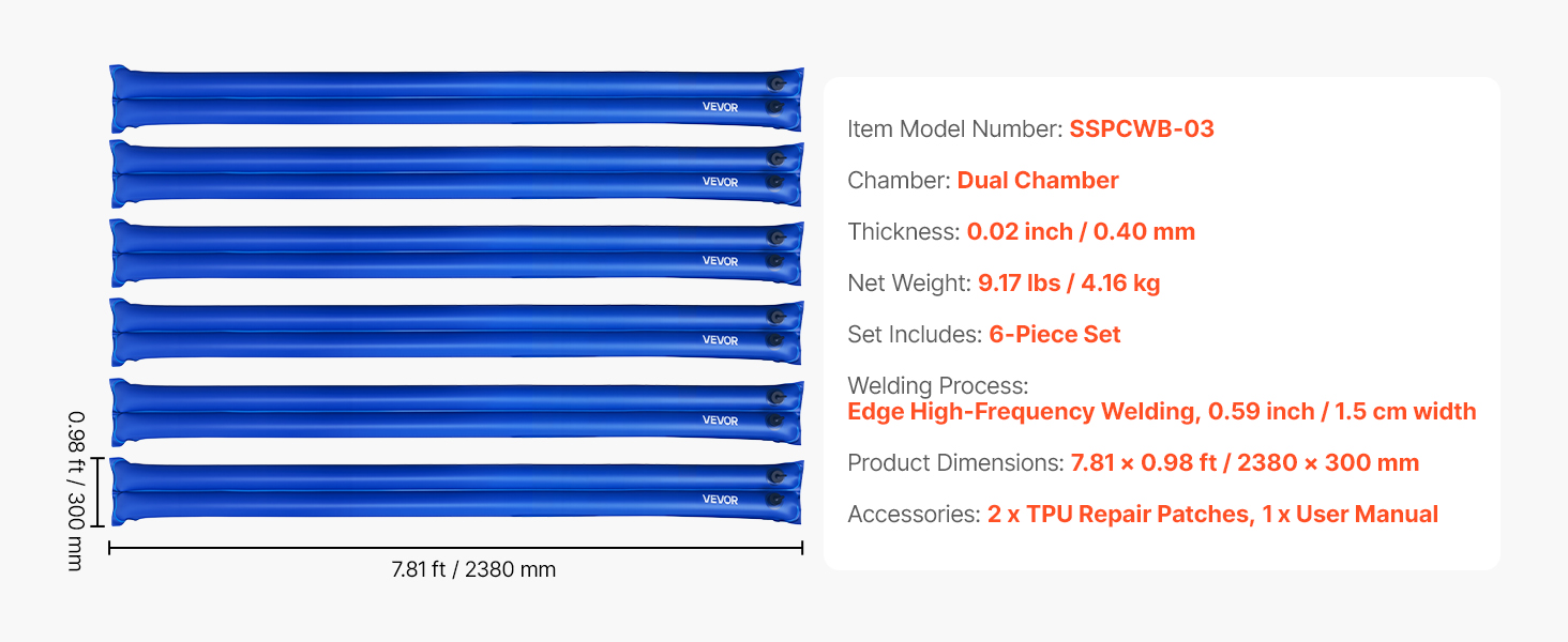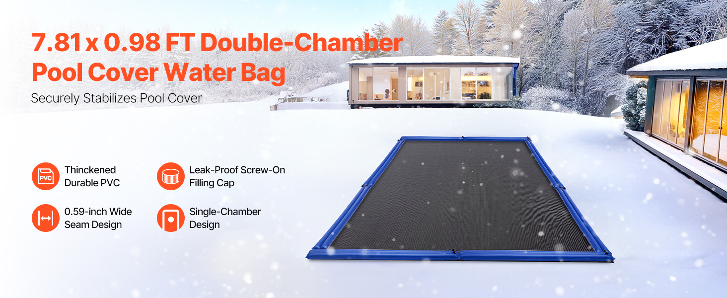 Každá vodná rúrka bazénového krytu s rozmermi 93,7 x 11,81 palca je špeciálne vyrobená na zimu a pomáha zabezpečiť váš bazénový kryt v nepriaznivom počasí. Tieto vodné vaky na bazénové krytie, ktoré sú navrhnuté tak, aby zabránili vniknutiu lístia a nečistôt do bazéna, udržiavajú váš bazén čistý a skracujú čas potrebný na údržbu počas celej sezóny.