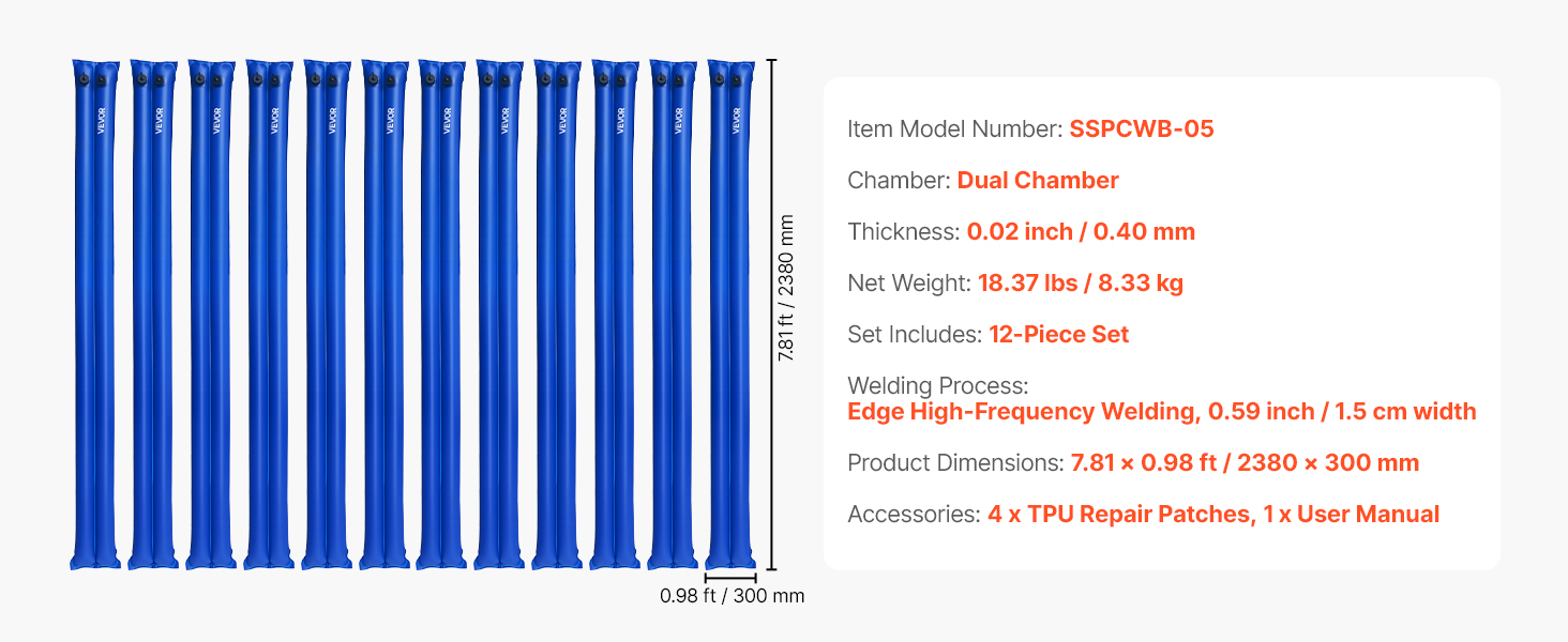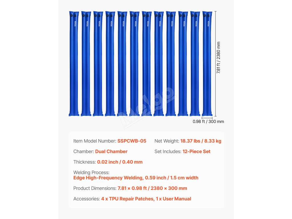 Každá vodná rúrka bazénového krytu s rozmermi 93,7 x 11,81 palca je špeciálne vyrobená na zimu a pomáha zabezpečiť váš bazénový kryt v nepriaznivom počasí. Tieto vodné vaky na bazénové krytie, ktoré sú navrhnuté tak, aby zabránili vniknutiu lístia a nečistôt do bazéna, udržiavajú váš bazén čistý a skracujú čas potrebný na údržbu počas celej sezóny.