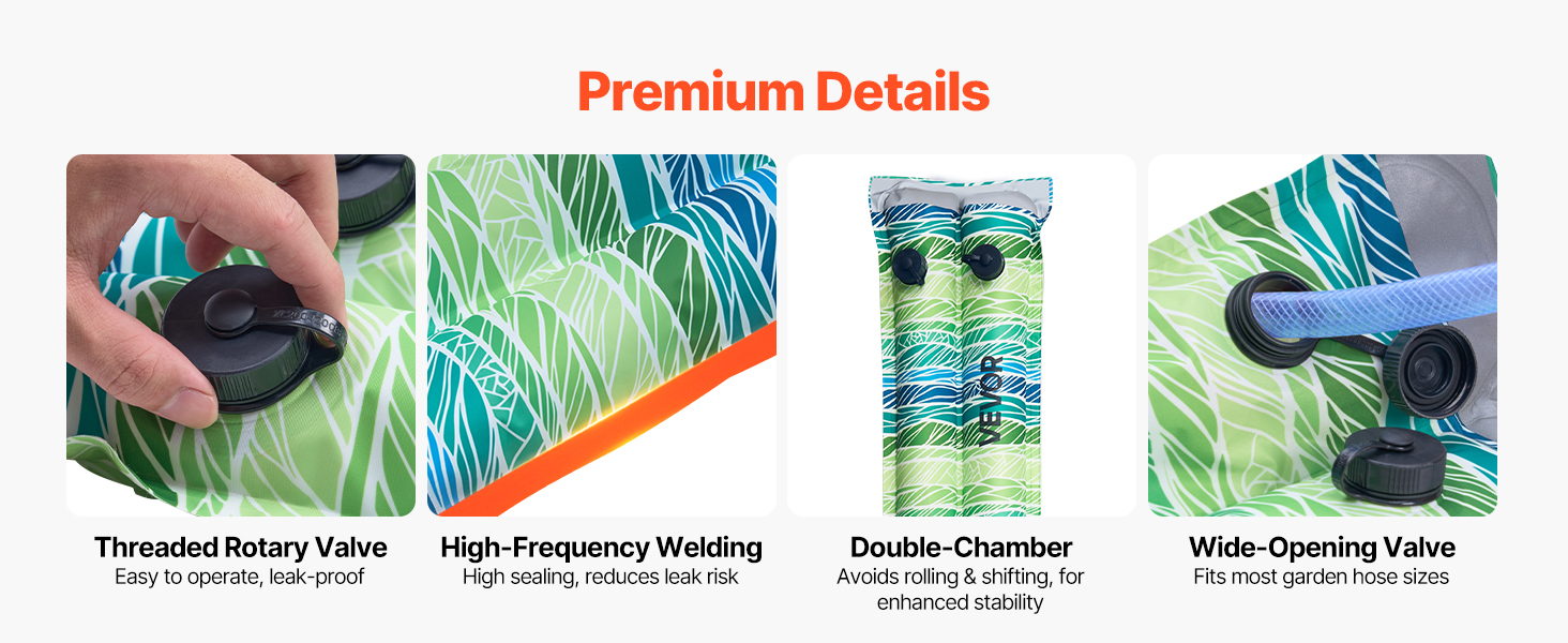 Sú vybavené vnútorným skrutkovacím ventilom na plynulú prevádzku bez úniku. Široký otvor je vhodný pre väčšinu záhradných hadíc na rýchle plnenie. Vysokofrekvenčne zvárané 0,59" švy zabezpečujú bezpečné utesnenie, zatiaľ čo dvojkomorová konštrukcia zabraňuje pretáčaniu a posúvaniu pre väčšiu stabilitu.