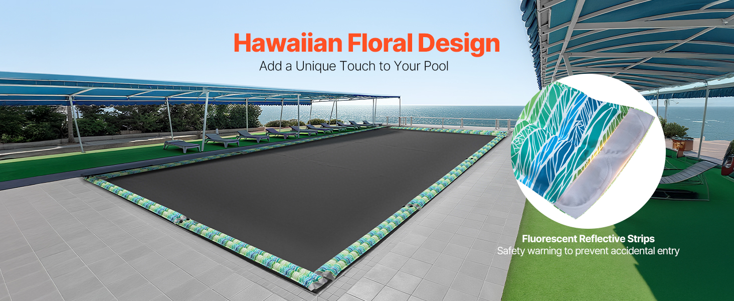 Naše zimné vaky na vodu na zakrytie bazéna majú havajskú potlač inšpirovanú tropickým podnebím, ktorá dodá vašim dekoráciám pri bazéne živý nádych. Reflexné prúžky v rohoch zabezpečujú dobrú viditeľnosť za súmraku alebo pri slabom osvetlení, čím ponúkajú dodatočnú vrstvu bezpečnosti v okolí bazéna.