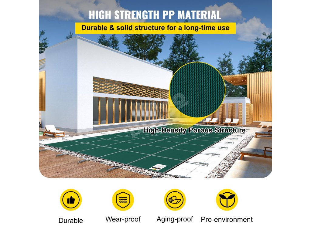 Bezpečnostný kryt bazéna VEVOR sme navrhli tak, aby poskytoval maximálnu bezpečnosť a pokoj. Zaručuje, že váš bazén zostane v bezpečí a chránený pred nečistotami, lístím a inými prvkami. Tento kryt tvorí vysokokvalitný polypropylén, ktorý je pevný a zároveň má dlhú životnosť. Pevný sieťovaný povrch zabraňuje náhodným pádom a udržiava priestor vášho bazéna bezpečný pre deti a domáce zvieratá. Bezpečné uchytenie a robustné mosadzné zemné skrutky poskytujú dodatočnú stabilitu. Tento bezpečnostný kryt je ideálny na udržiavanie čistého a bezpečného prostredia bazéna počas celého roka.