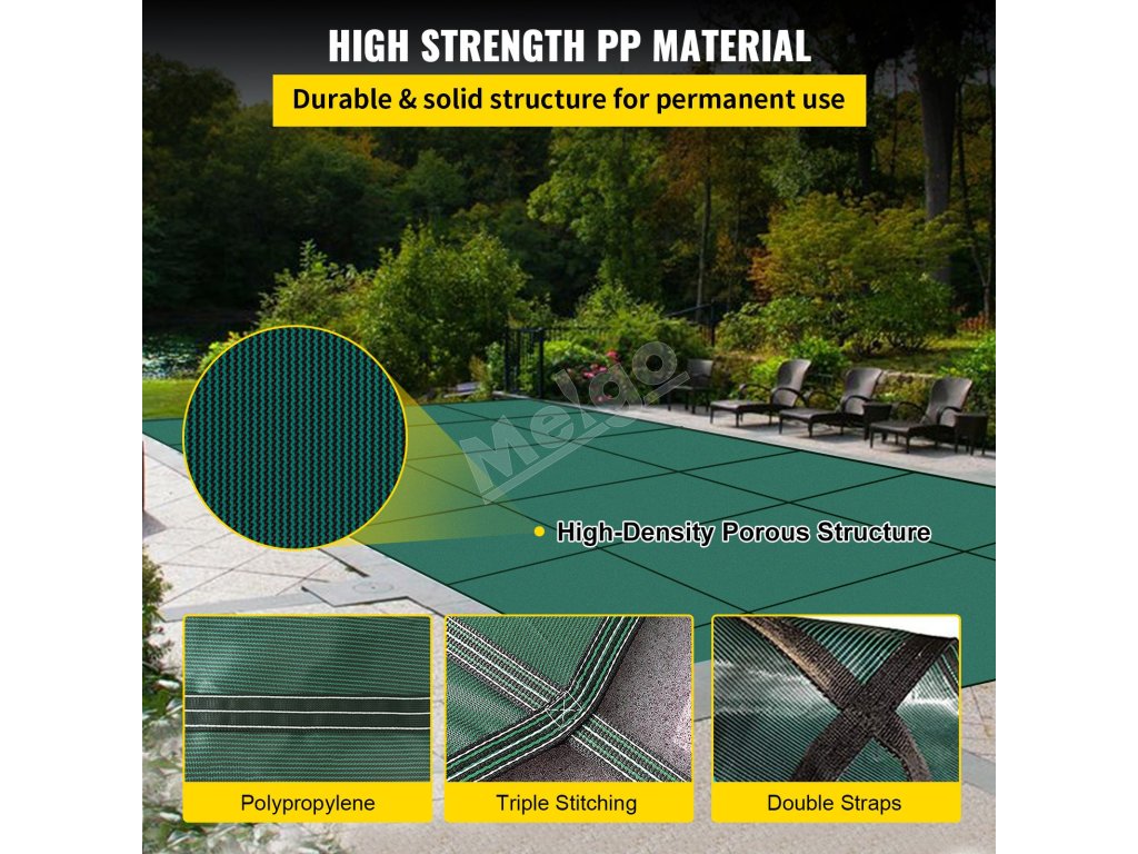 Bezpečnostný kryt bazéna VEVOR zabraňuje tomu, aby sa do vášho bazéna dostalo lístie a prach. Vďaka dvojitým popruhom a robustnej konštrukcii zabraňuje vniknutiu neporiadku. Vďaka tejto údržbe nebudete musieť tráviť veľa času čistením bazéna. Kryt pomáha vášmu bazénu zostať pekný a pripravený na používanie, pričom je potrebné menej časté čistenie. Pomáha tiež udržiavať čistotu bazéna medzi jednotlivými použitiami, čím šetrí váš čas a námahu.