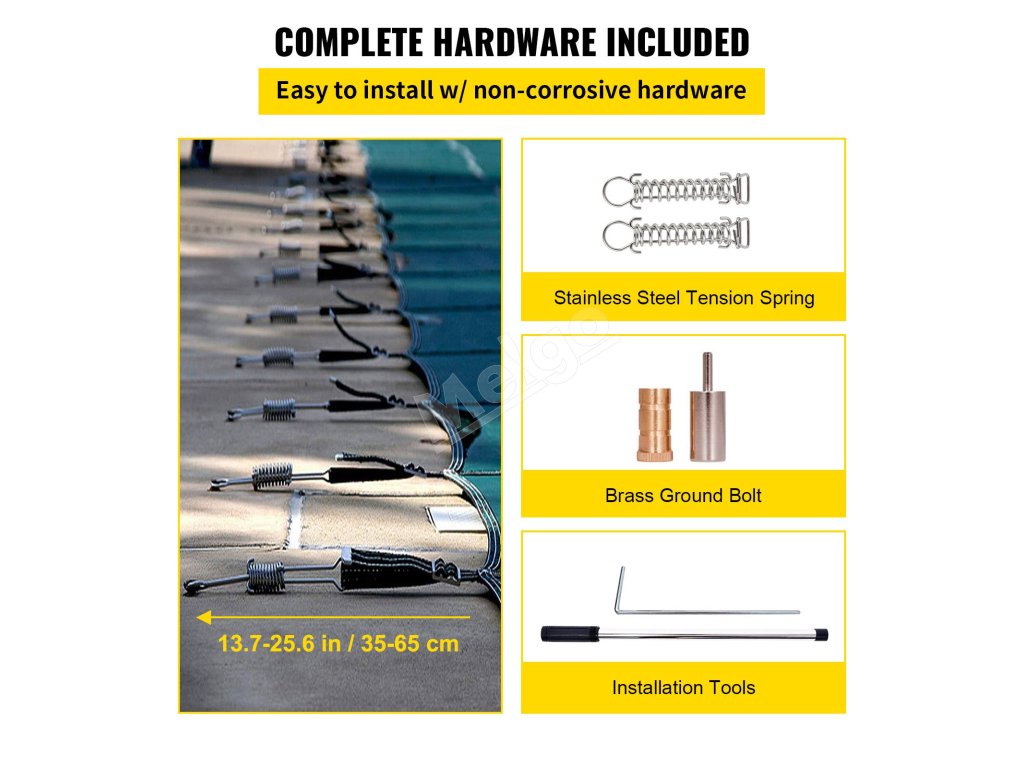 Tento zelený sieťový kryt bazéna je vyrobený tak, aby sa dal ľahko nastaviť. Obsahuje všetko, čo potrebujete: ťažné pružiny, mosadzné kotvy a tyče z nehrdzavejúcej ocele. Všetky tieto časti uľahčujú nasadenie krytu na váš bazén. Jasné pokyny a priložené diely vám pomôžu pri rýchlom nastavení. Či už si radi robíte veci sami, alebo len chcete jednoduché riešenie, tento kryt umožňuje rýchly a jednoduchý proces inštalácie. Zaručuje tiež bezpečné uchytenie, aby bol váš bazén chránený.
