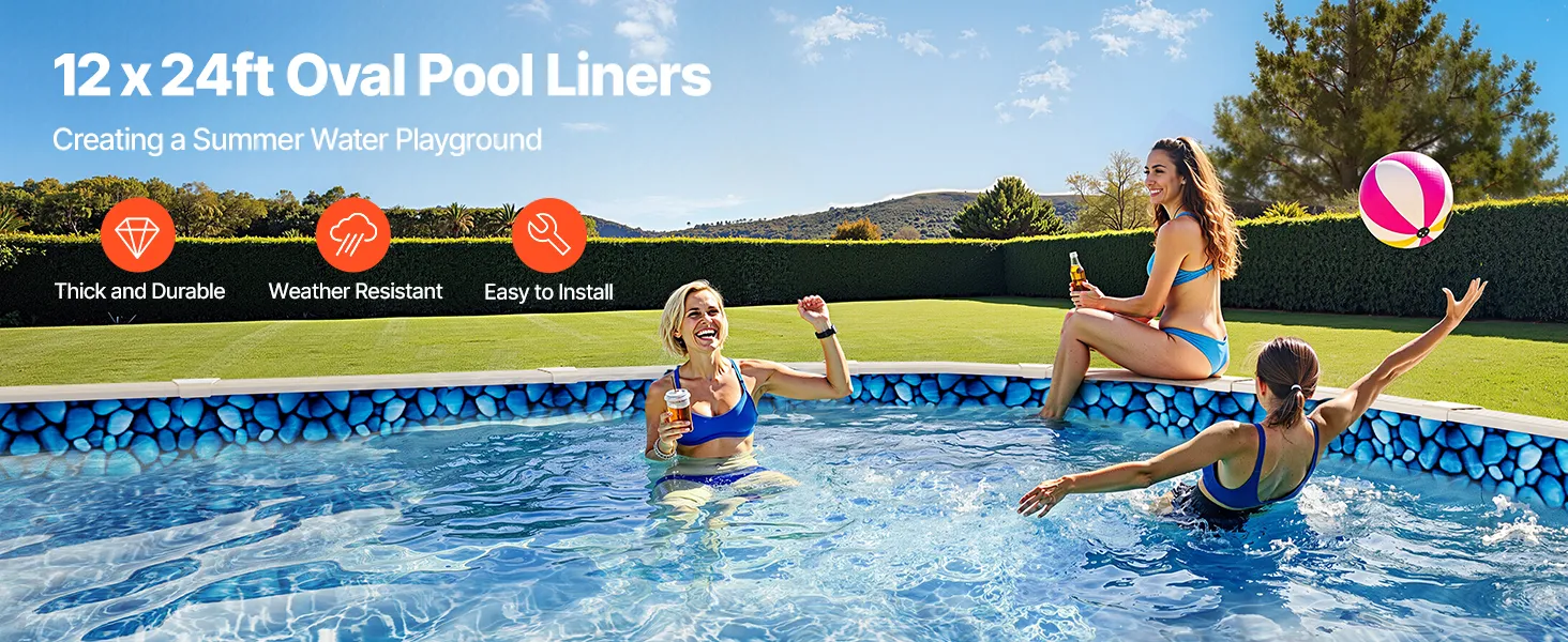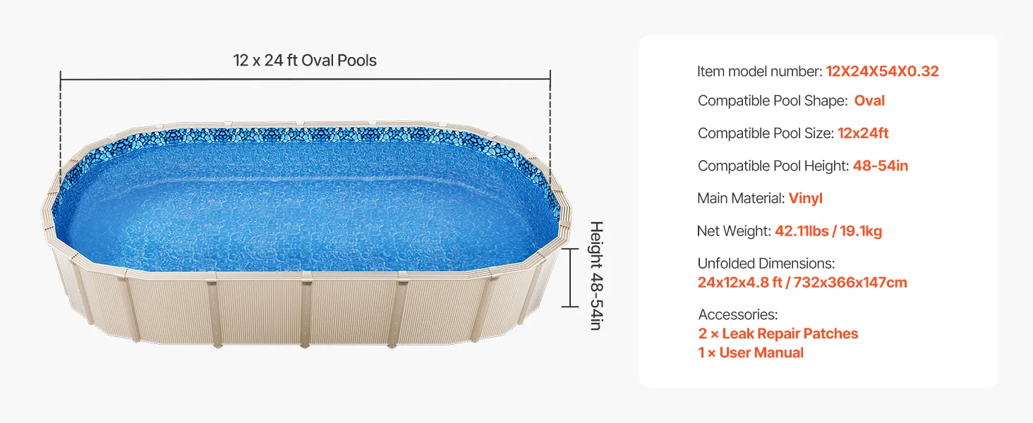 Táto bazénová vložka je vyrobená z odolného vinylu a je určená pre oválne bazény s rozmermi 12 × 24 stôp a výškou steny do 54 palcov. Je vyrobená tak, aby vydržala, je odolná voči opotrebovaniu, prepichnutiu a roztrhnutiu a zároveň ponúka vynikajúcu retenciu vody. Bazénová vložka zaručuje dlhodobé používanie vo vonkajšom prostredí.