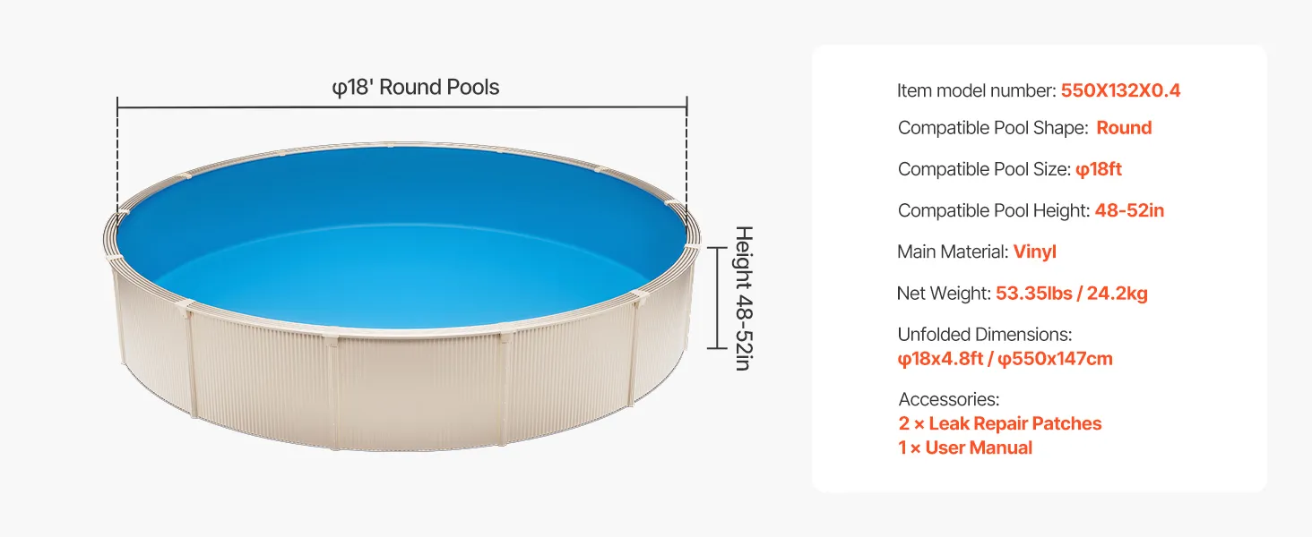 Táto bazénová vložka je vyrobená z odolného vinylu a je určená pre 18-metrové okrúhle bazény s výškou steny do 52 palcov. Je vyrobená tak, aby vydržala, je odolná voči opotrebovaniu, prepichnutiu a roztrhnutiu a zároveň ponúka vynikajúcu retenciu vody. Bazénová vložka zaručuje dlhodobé používanie vo vonkajšom prostredí.