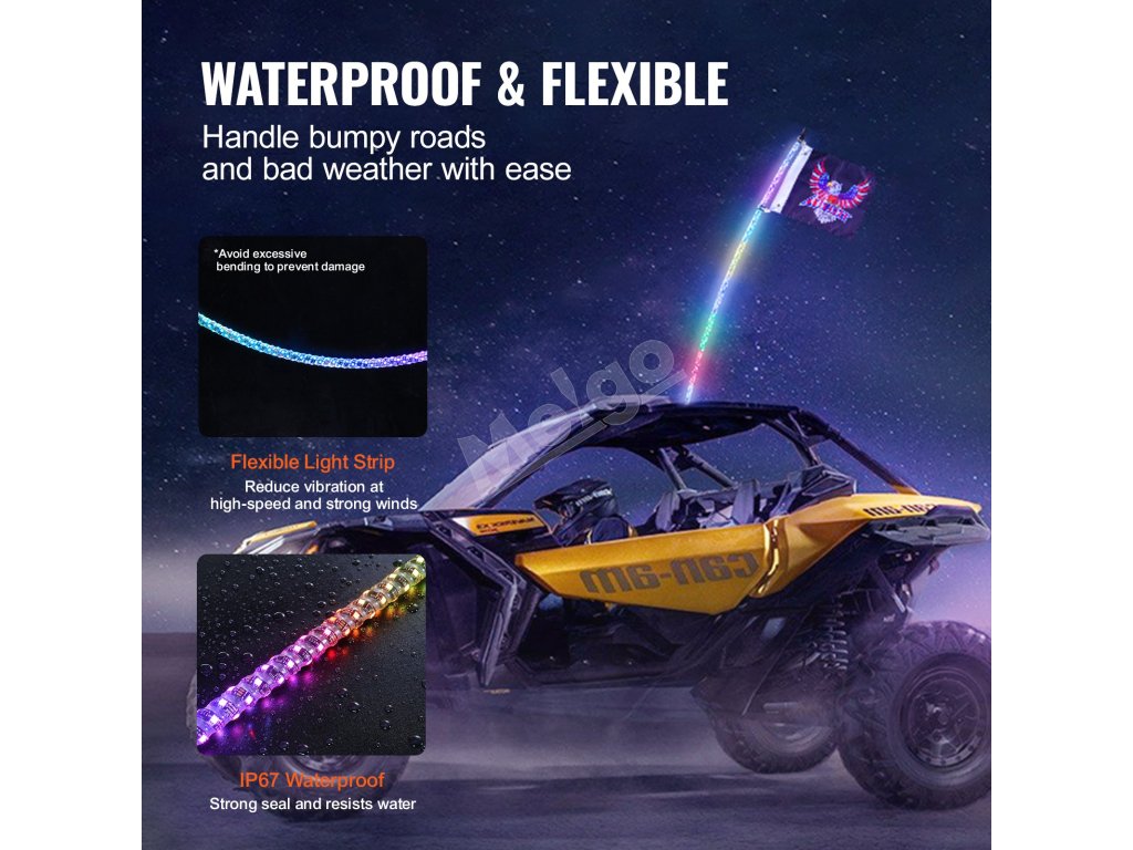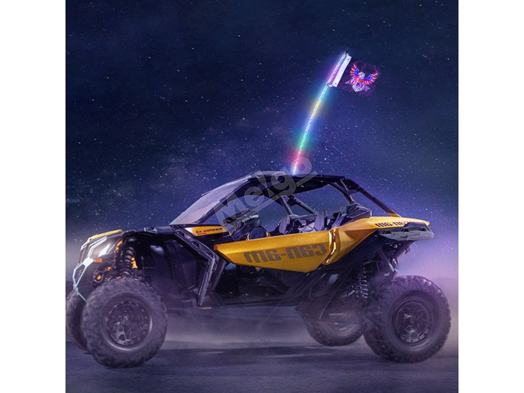 Ideálne pre vozidlá s napätím DC12V-24V vrátane UTV, ATV, motocyklov, RZR, Can-ams, nákladných vozidiel, terénnych vozidiel a motokár. Naše bičové svetlo zaručuje, že vaše vozidlo vynikne ako najjasnejšia prítomnosť počas nočných jázd a dobrodružstiev v teréne.
