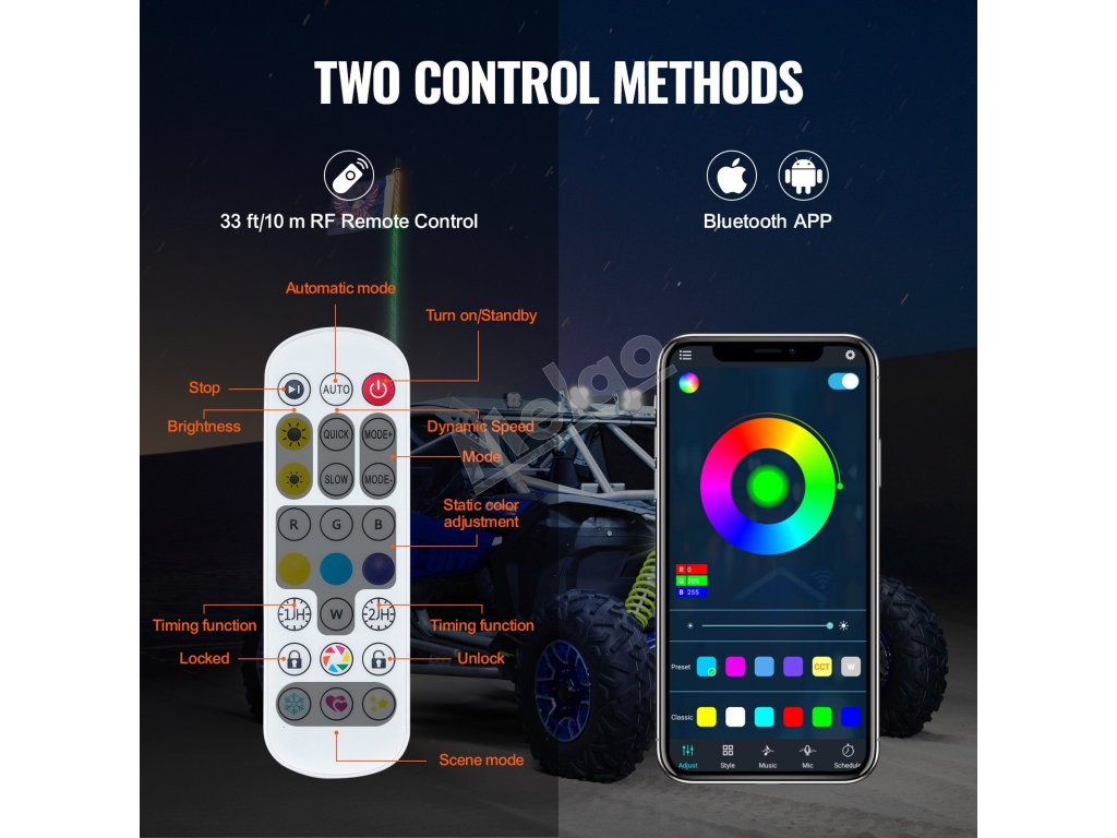 Jednoducho prevezmite velenie pomocou ovládania Bluetooth APP, ktoré je kompatibilné so systémami Android a IOS a premení vaše zariadenie na diaľkové ovládanie. Diaľkové ovládanie RF ponúka citlivú prevádzku v dosahu 33 stôp/10 m, čím zabezpečuje rýchle a presné ovládanie.