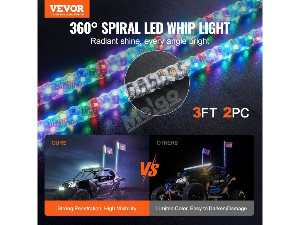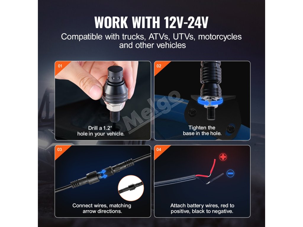 Ideálne pre vozidlá s napätím DC12V-24V vrátane UTV, ATV, motocyklov, RZR, Can-ams, nákladných vozidiel, terénnych vozidiel a motokár. Naše bičové svetlo zaručuje, že vaše vozidlo vynikne ako najjasnejšia prítomnosť počas nočných jázd a dobrodružstiev v teréne.