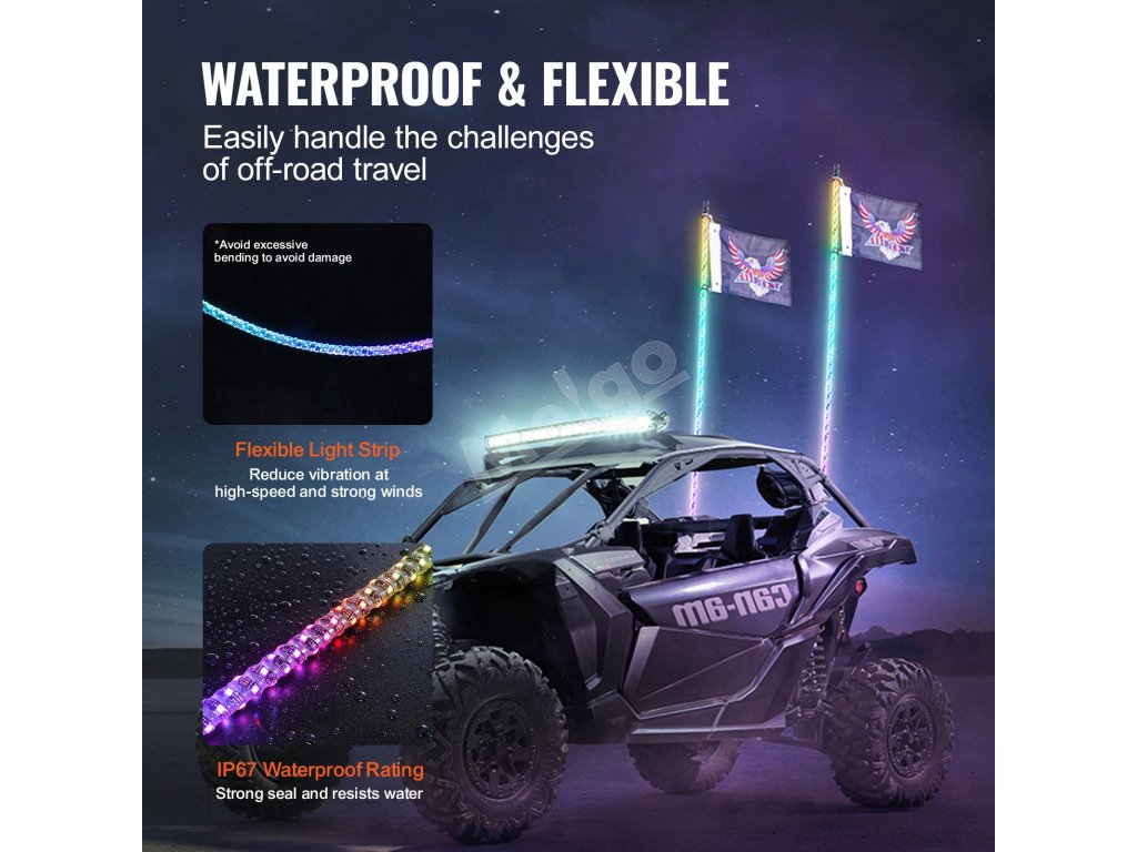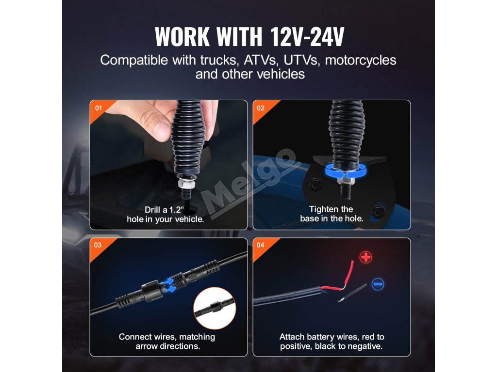 Ideálne pre vozidlá s napätím DC12V-24V vrátane UTV, ATV, motocyklov, RZR, Can-am, nákladných vozidiel, terénnych vozidiel a motokár. Naše bičové svetlo zaručuje, že vaše vozidlo vynikne ako najjasnejšia prítomnosť počas nočných jázd a dobrodružstiev v teréne.