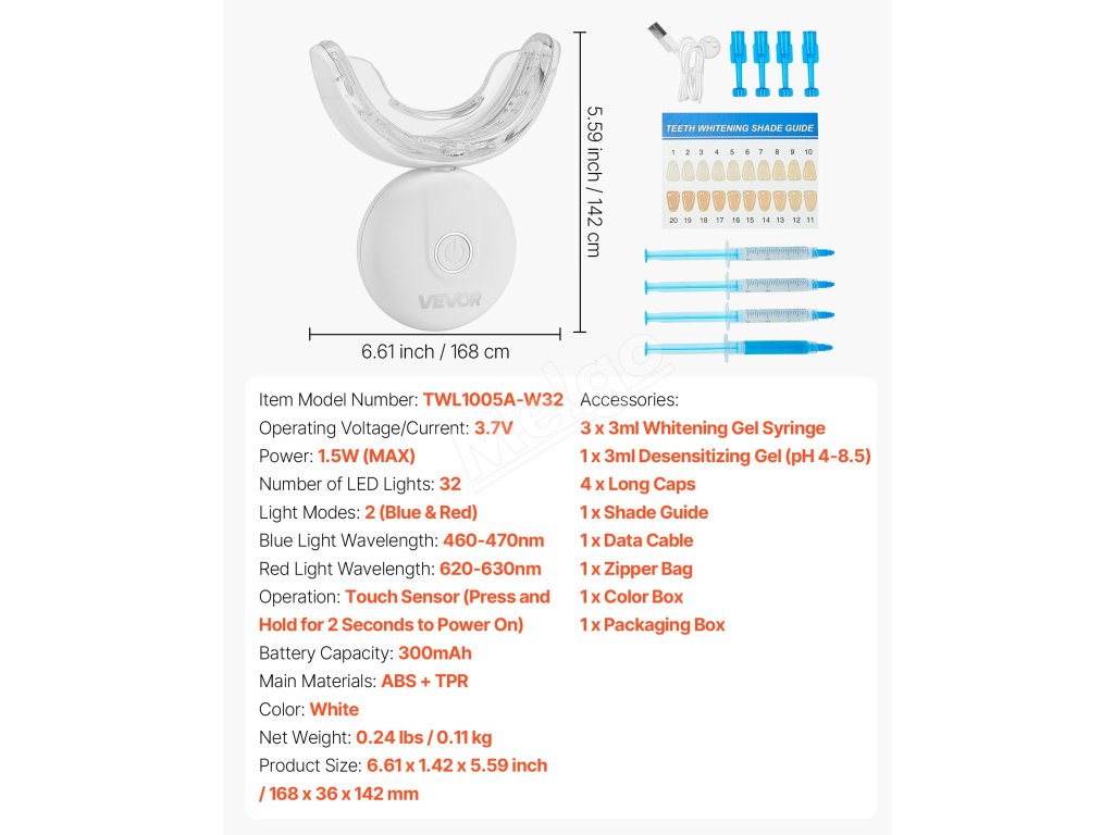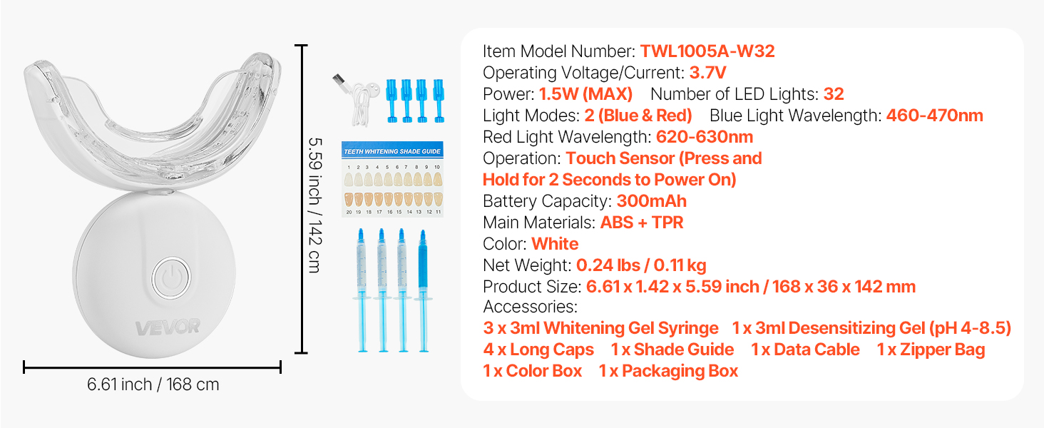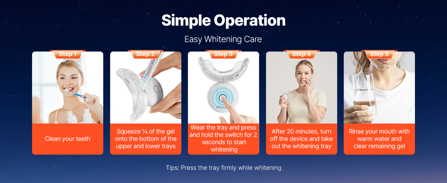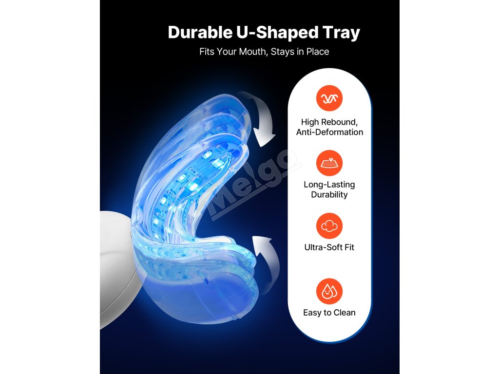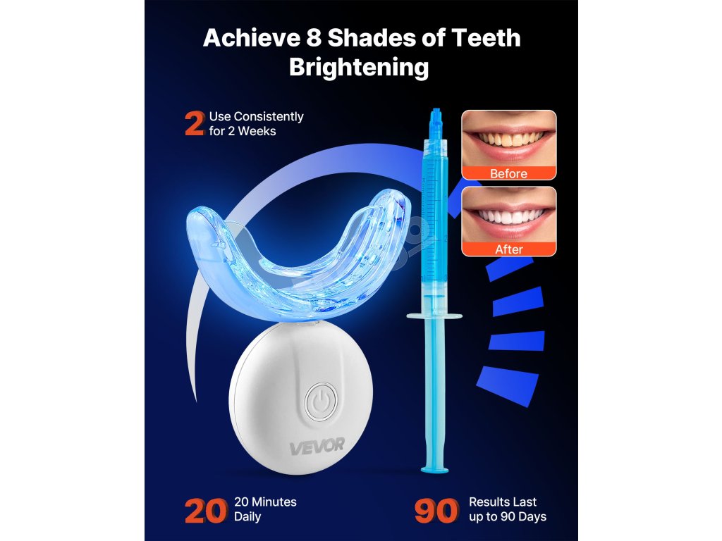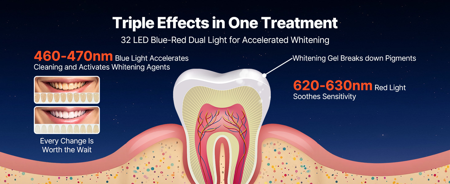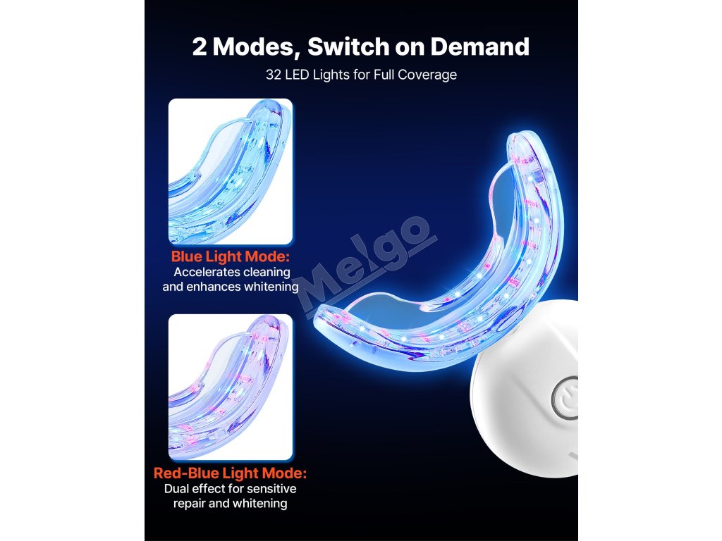 Modré svetlo LED na bielenie zubov aktivuje hĺbkové čistiace a bieliace látky, zatiaľ čo červené svetlo zmierňuje nepríjemné pocity na ďasnách. Používajte s bieliacim gélom na rozjasnenie prirodzenej farby zubov zvnútra.