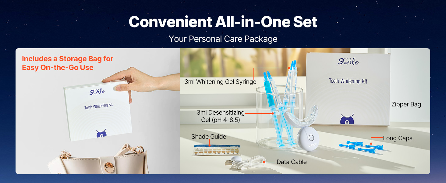 Bieliaca lampa na zuby sa dodáva s kompletnou sadou príslušenstva a cestovným puzdrom. Kompaktná a ľahká - ľahko sa zmestí do toaletnej tašky alebo kufra, takže vaše bielenie nebude mať nikdy prestávku, ani keď budete cestovať.