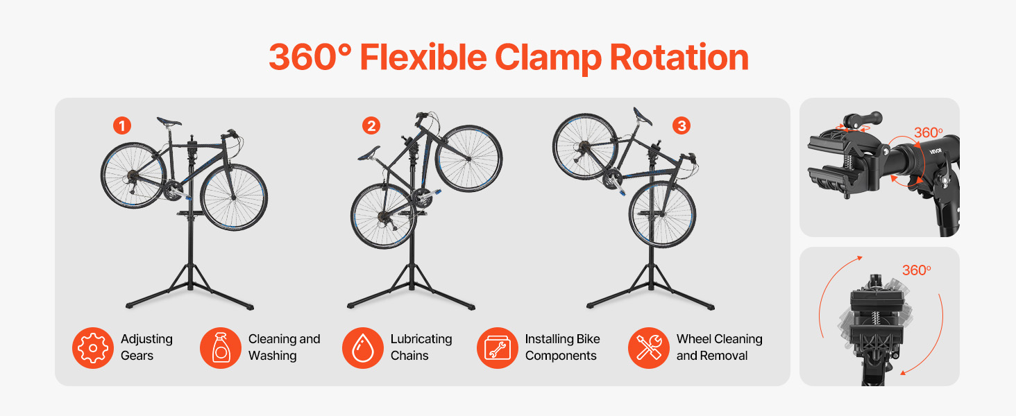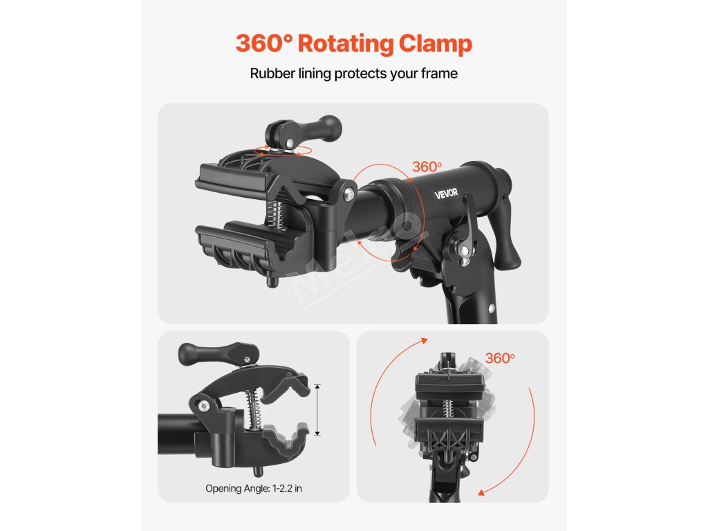 Stojan na opravu bicyklov je vybavený 360° otočnou svorkou, ktorá zabezpečuje pohodlnú polohu rúk pri práci na rôznych častiach bicykla.