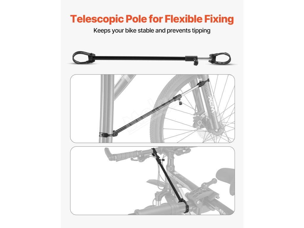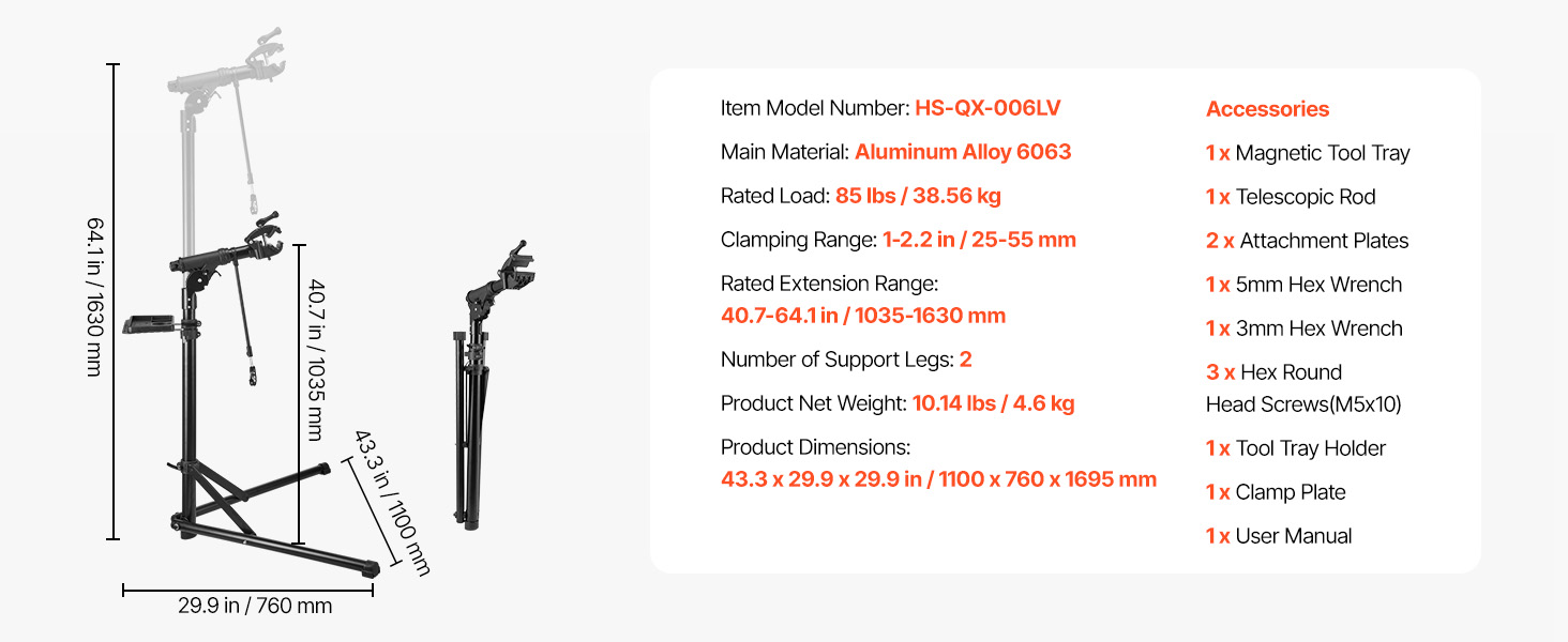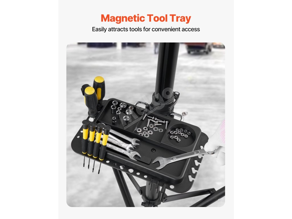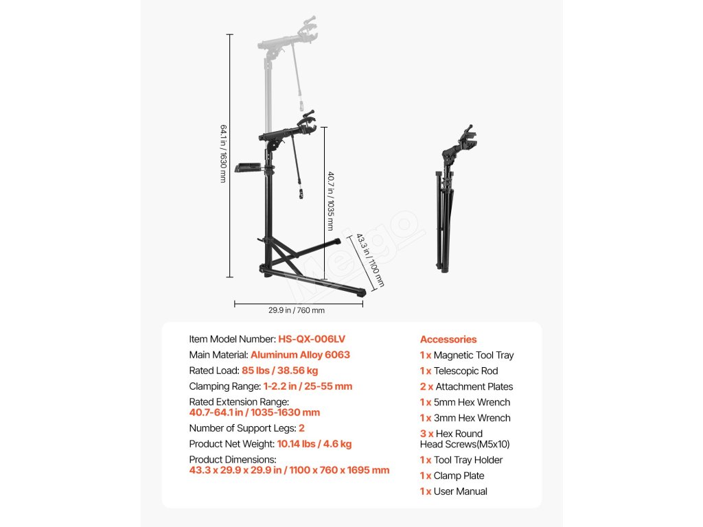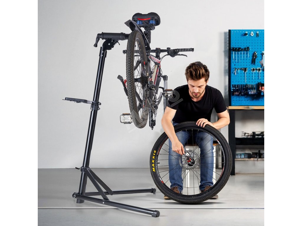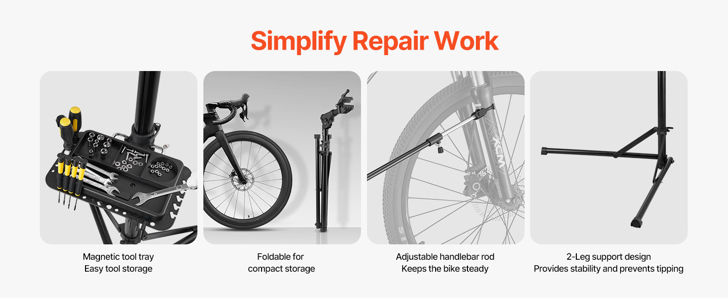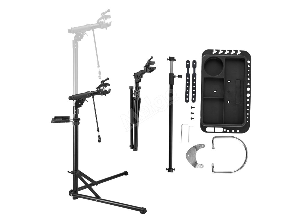 Stojan na údržbu bicyklov je vybavený rôznym príslušenstvom, má nastaviteľnú tyč na riadidlá, ktorá udržiava predné koleso v stabilnej polohe, magnetický zásobník na rýchle usporiadanie náradia a dvojnohú konštrukciu na stabilnú oporu bez prevrátenia.