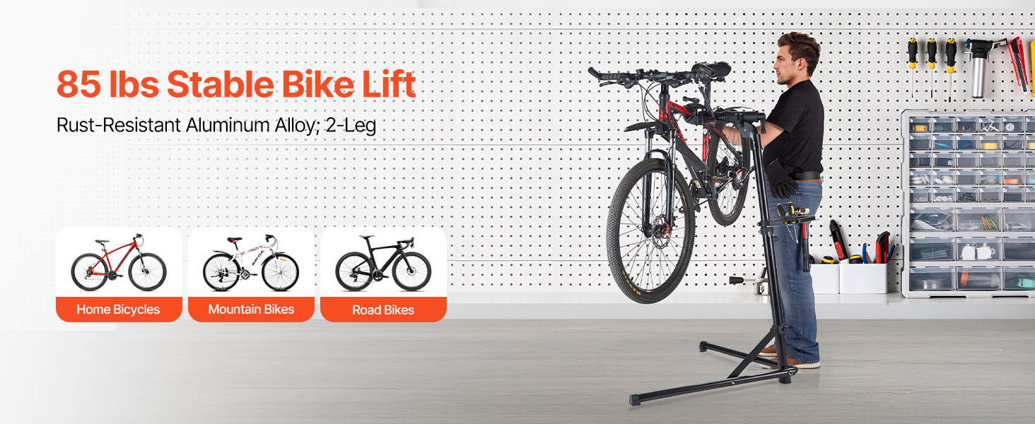 Tento stojan na opravu bicyklov unesie 85 lb/38,56 kg a je ideálny pre domáce, horské a cestné bicykle. Náš pracovný stojan na bicykle je vyrobený z odolného zliatinového materiálu s konštrukciou s dvoma nohami pre stabilitu a obsahuje predný stabilizátor bicykla a magnetický zásobník na náradie pre jednoduchú údržbu.