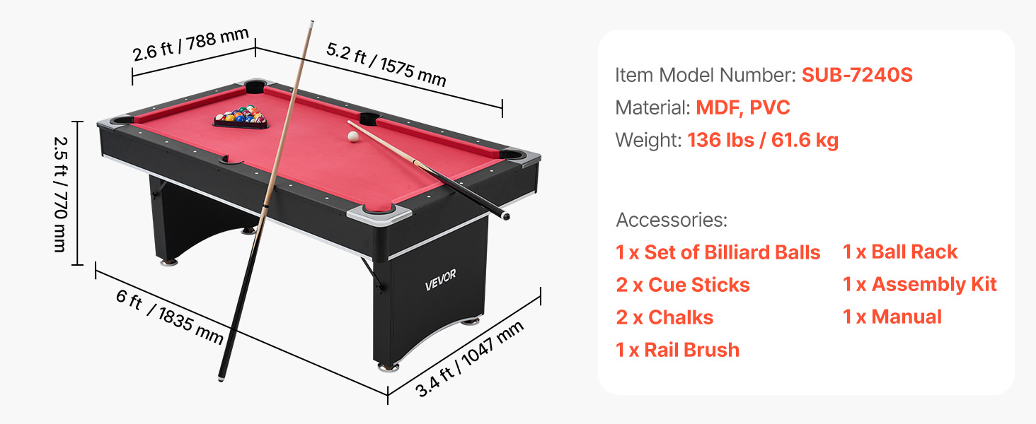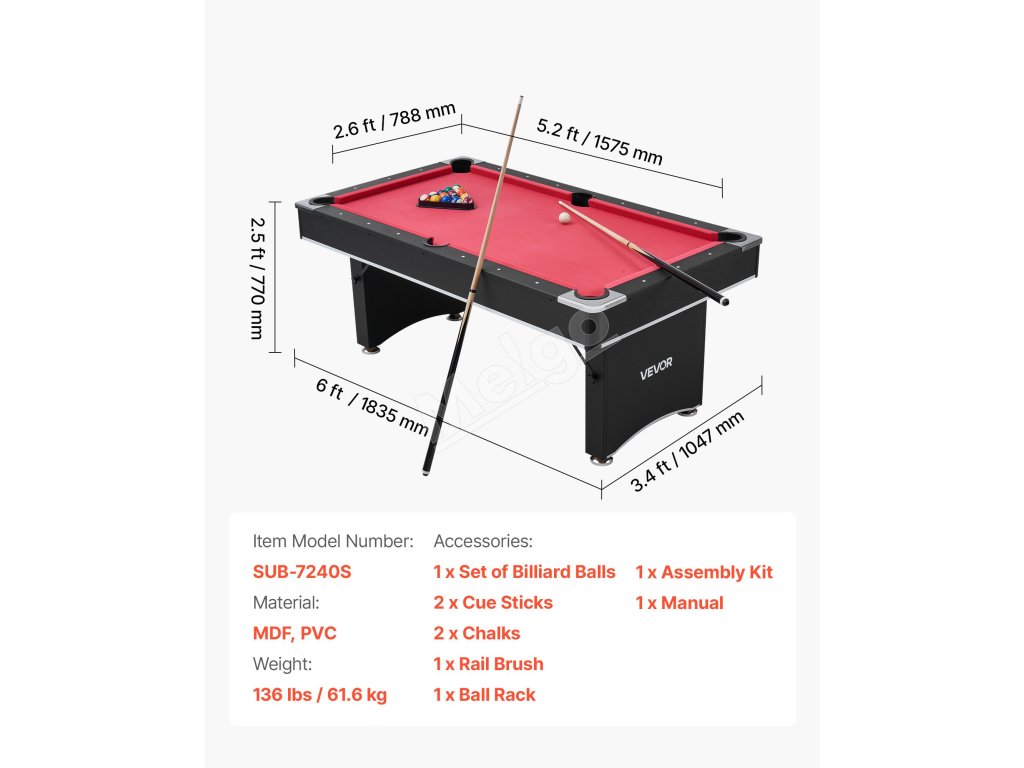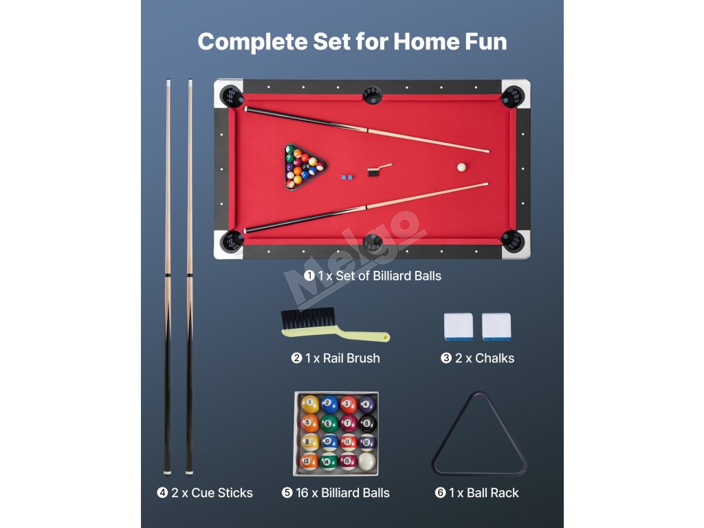 Táto biliardová súprava obsahuje všetko potrebné: tága, gule, kriedu, štetec a trojuholník. Nechýbajú žiadne súčasti. Jednoducho rozbaľte balenie, roztiahnite nohy a v priebehu niekoľkých minút ste pripravení hrať svoju prvú hru.