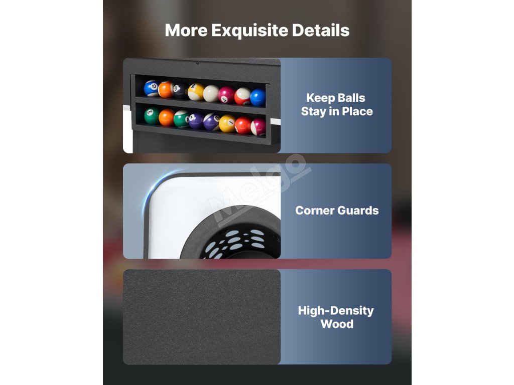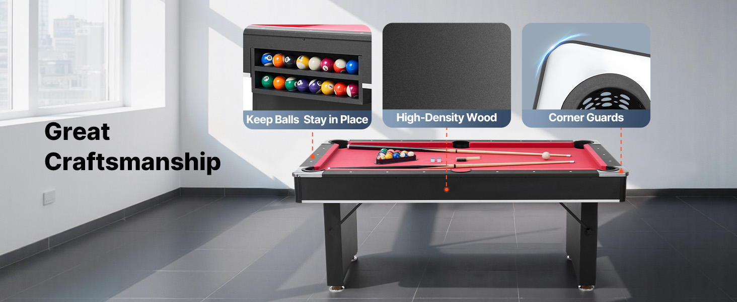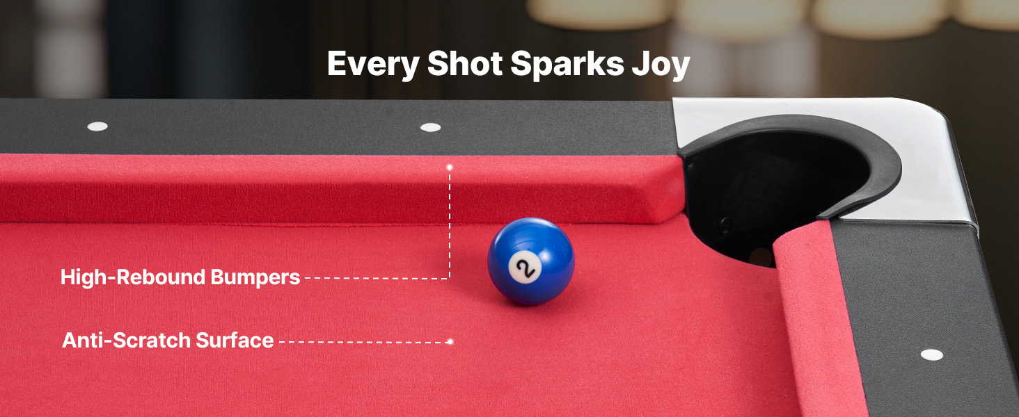 Spevnené vrecká bezpečne držia gule, zatiaľ čo rohy chránia stôl aj vaše steny. Kvalitný plstený povrch a pružné vankúšové nárazníky spájajú eleganciu s dlhotrvajúcou odolnosťou.