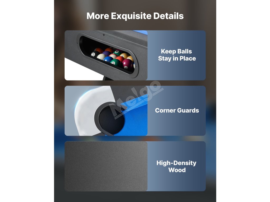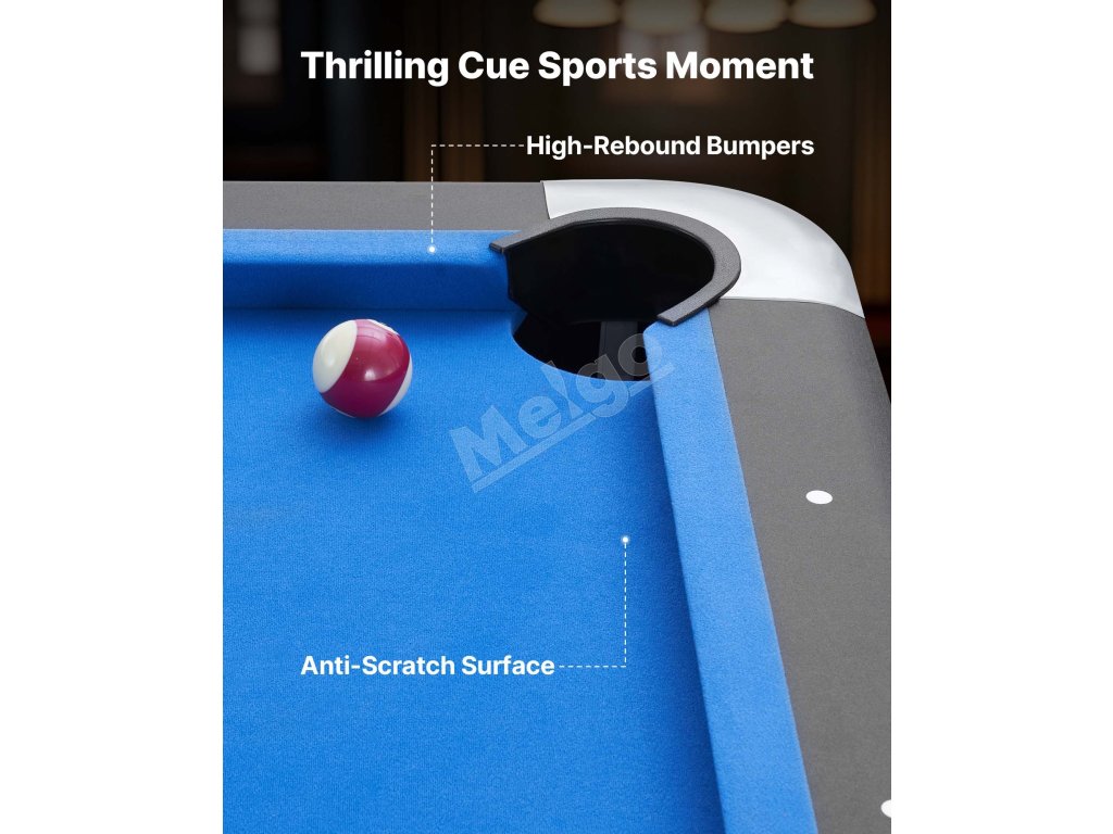 Spevnené vrecká bezpečne držia gule, zatiaľ čo rohy chránia stôl aj vaše steny. Kvalitný plstený povrch a pružné vankúšové nárazníky spájajú eleganciu s dlhotrvajúcou odolnosťou.