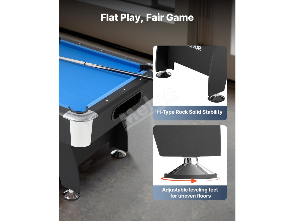Táto súprava biliardového stola má rám vyrobený z prvotriednej MDF dosky, ktorá zaručuje výnimočnú robustnosť a dlhodobú životnosť. Nastaviteľné nivelačné nožičky navyše zabezpečujú stabilnú a vyváženú hraciu plochu aj na nerovných podlahách.