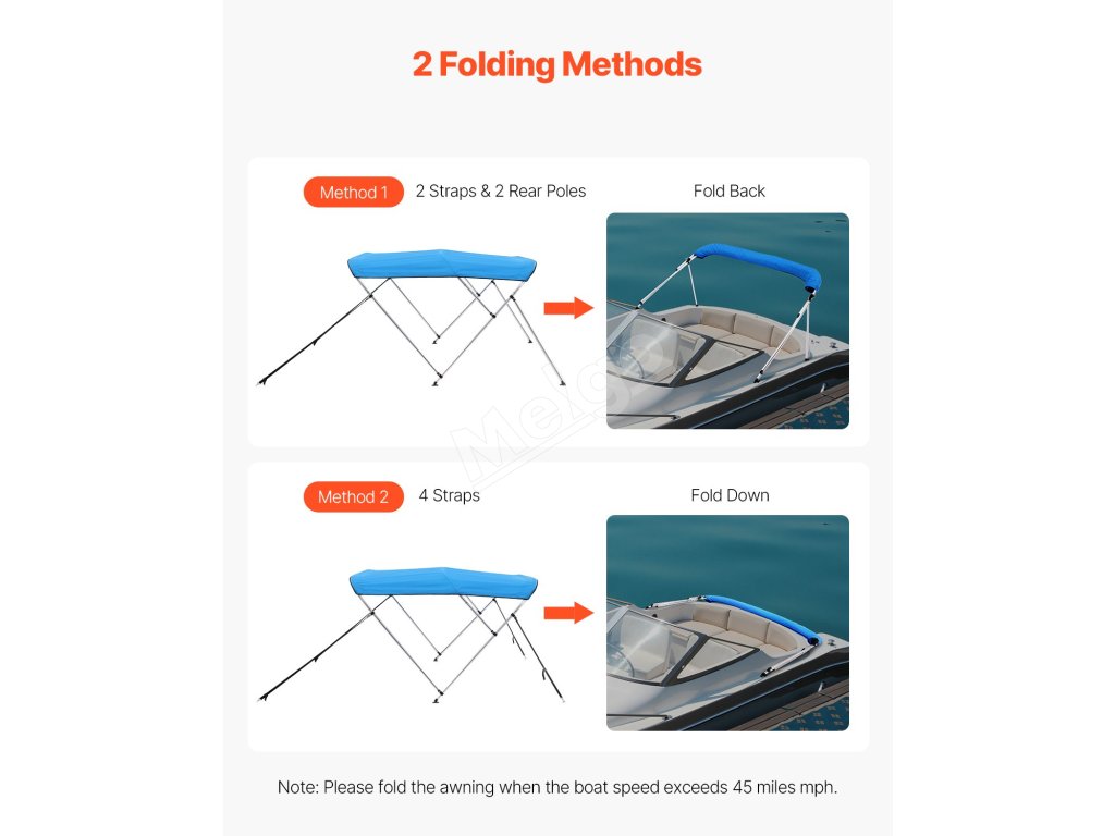Vyberte si z dvoch spôsobov inštalácie na upevnenie markízy na vašej lodi, ktoré umožňujú sklápanie smerom nadol aj dozadu. Dodané popruhy s rýchloupínacími prackami umožňujú rýchle a jednoduché nastavenie.
