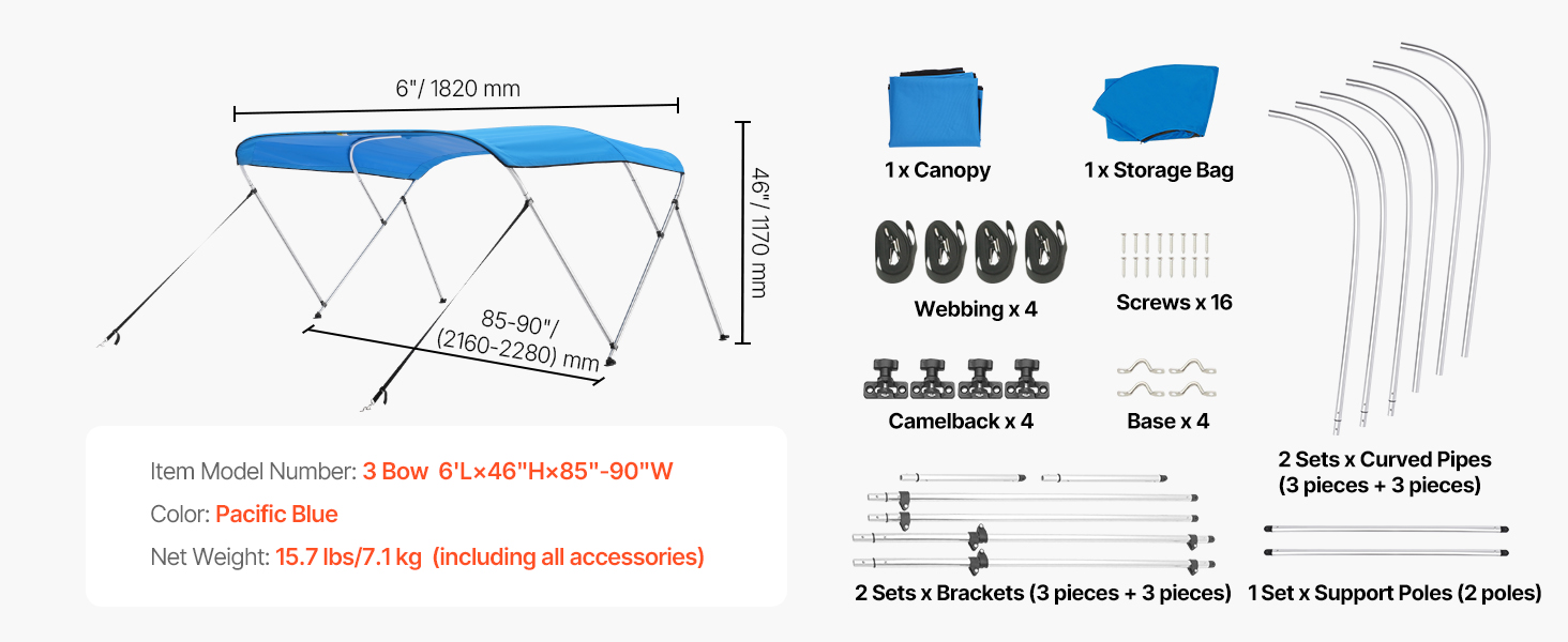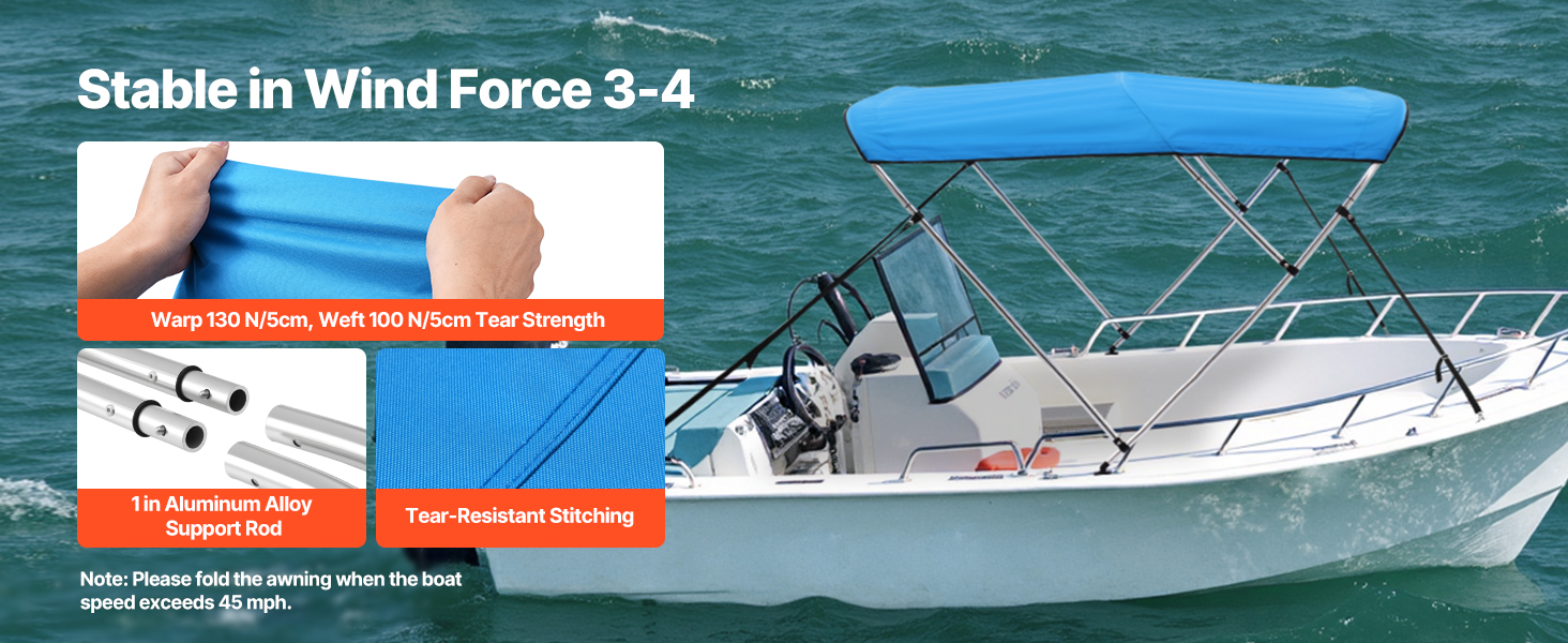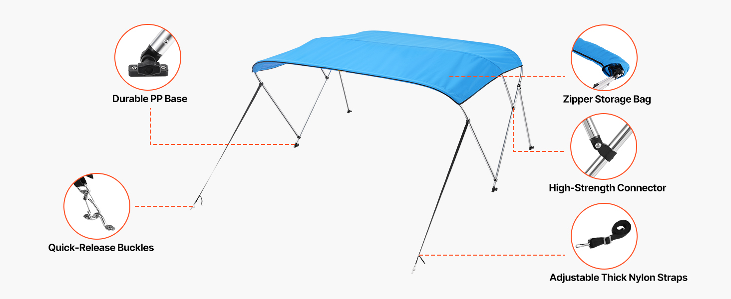 Vďaka 1" hrubým nosným tyčiam z hliníkovej zliatiny a odolnej základni z PP je táto strecha bimini na loď bezpečne pripevnená k vašej lodi. Materiály odolné proti korózii zabezpečujú, že nebude korodovať vplyvom morskej vody alebo dažďa.
