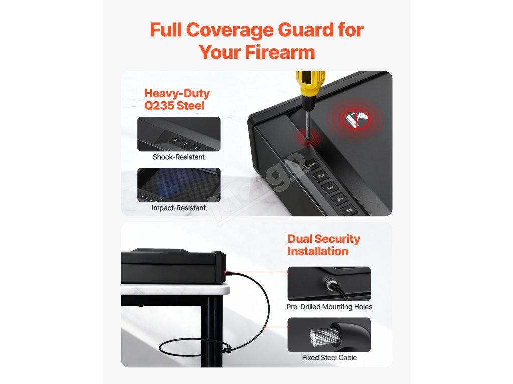 Tento trezor na zbrane zabezpečí váš domov a cennosti. Pojme 2 ručné zbrane a 2 zásobníky s prístupom pomocou odtlačkov prstov, kódu a kľúča. Nočné osvetlenie a tichý režim umožňujú rýchle a diskrétne použitie pri slabom osvetlení.