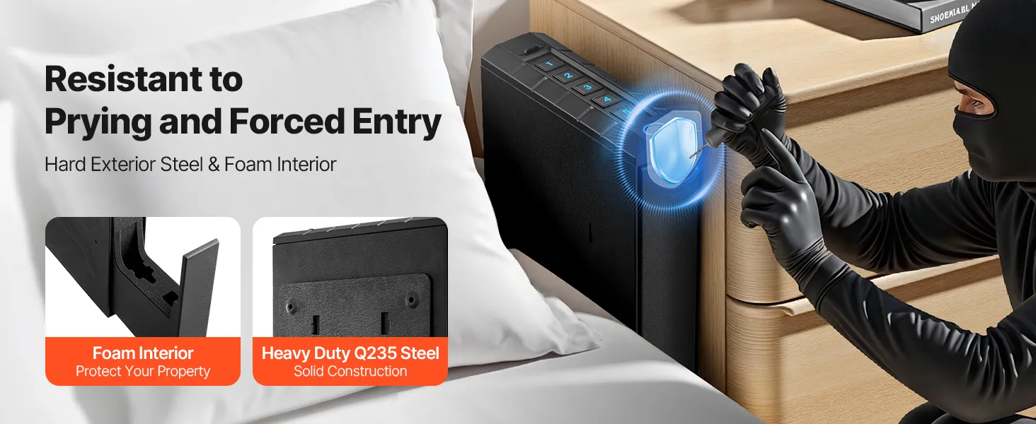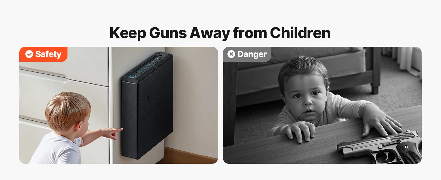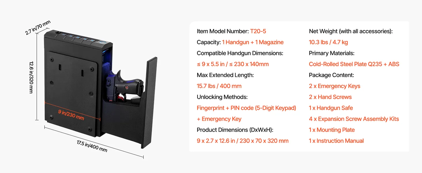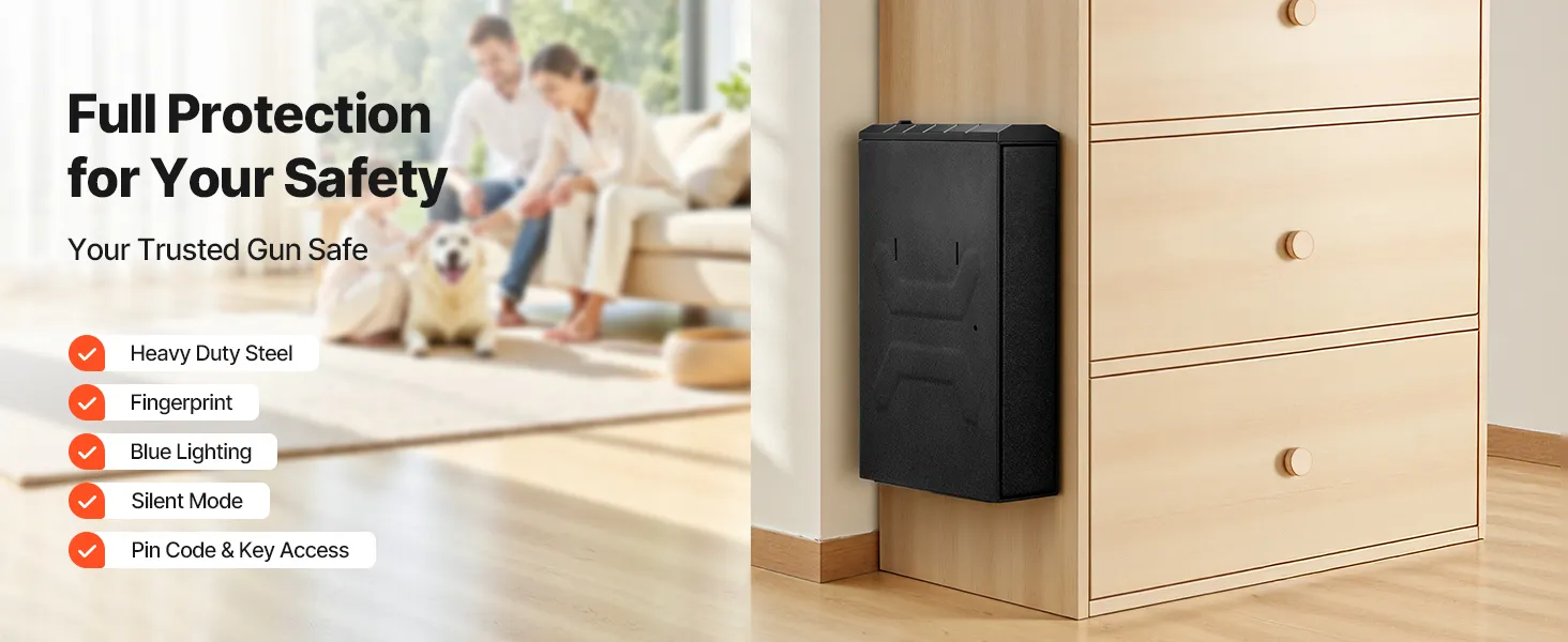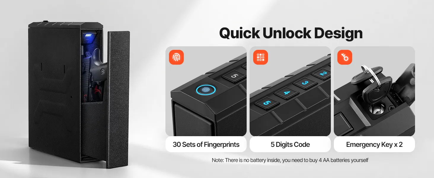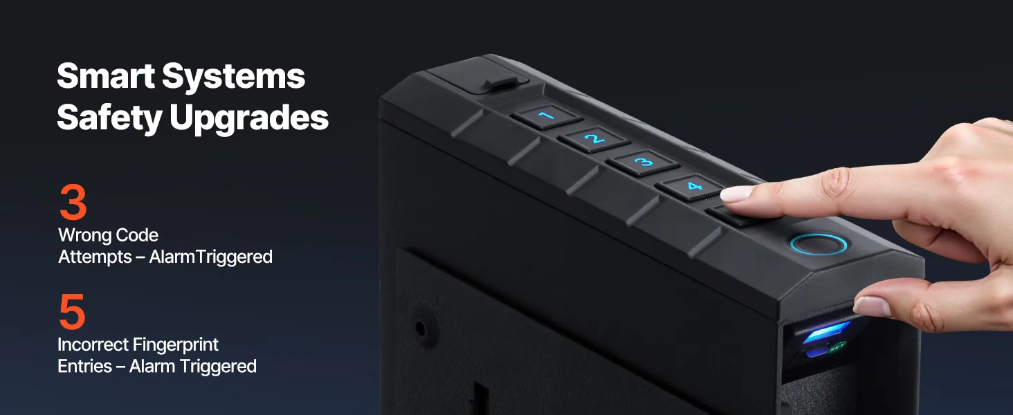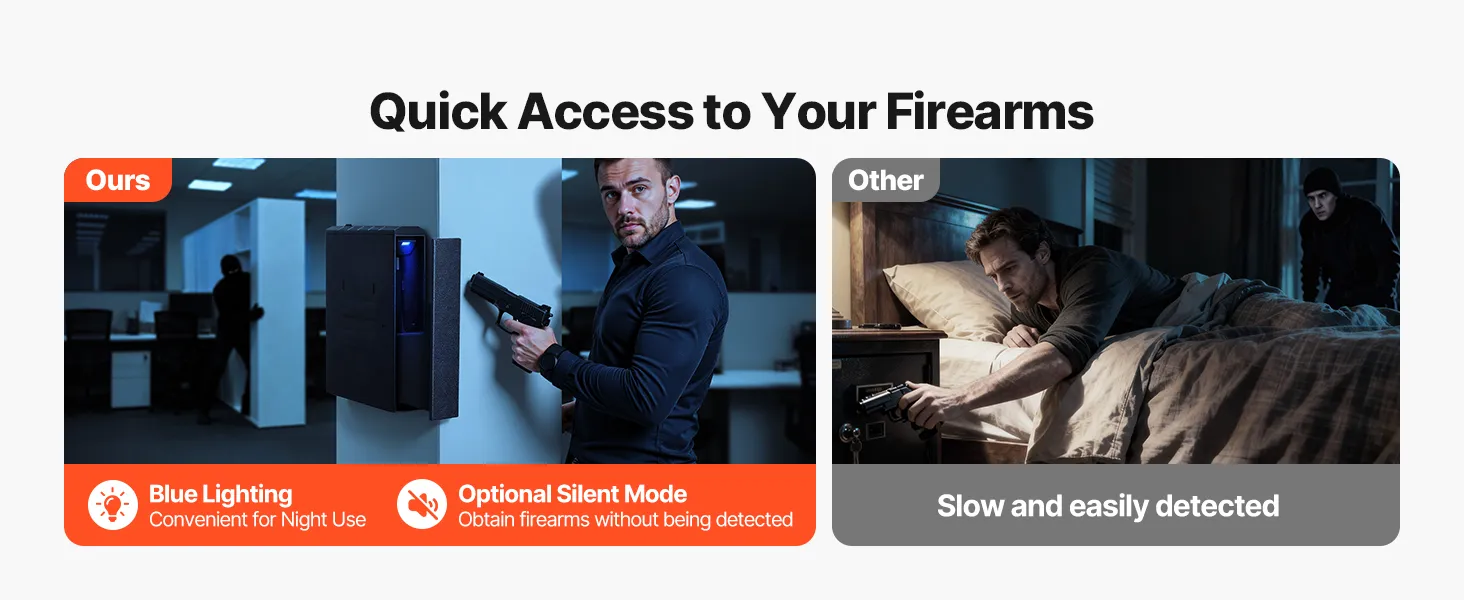 Tento trezor na zbrane zabezpečí váš domov a cennosti. Uloží 1 ručnú zbraň a 1 zásobník s prístupom pomocou odtlačku prsta, kódu a kľúča. Nočné modré svetlo a tichý režim umožňujú rýchle a diskrétne použitie pri slabom osvetlení.